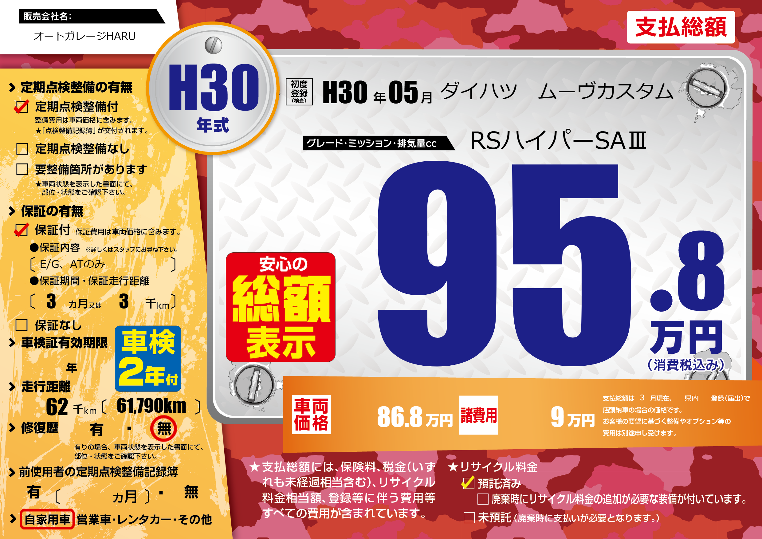 | 車名 | ダイハツ ムーヴカスタム | グレード ミッション 排気量 |