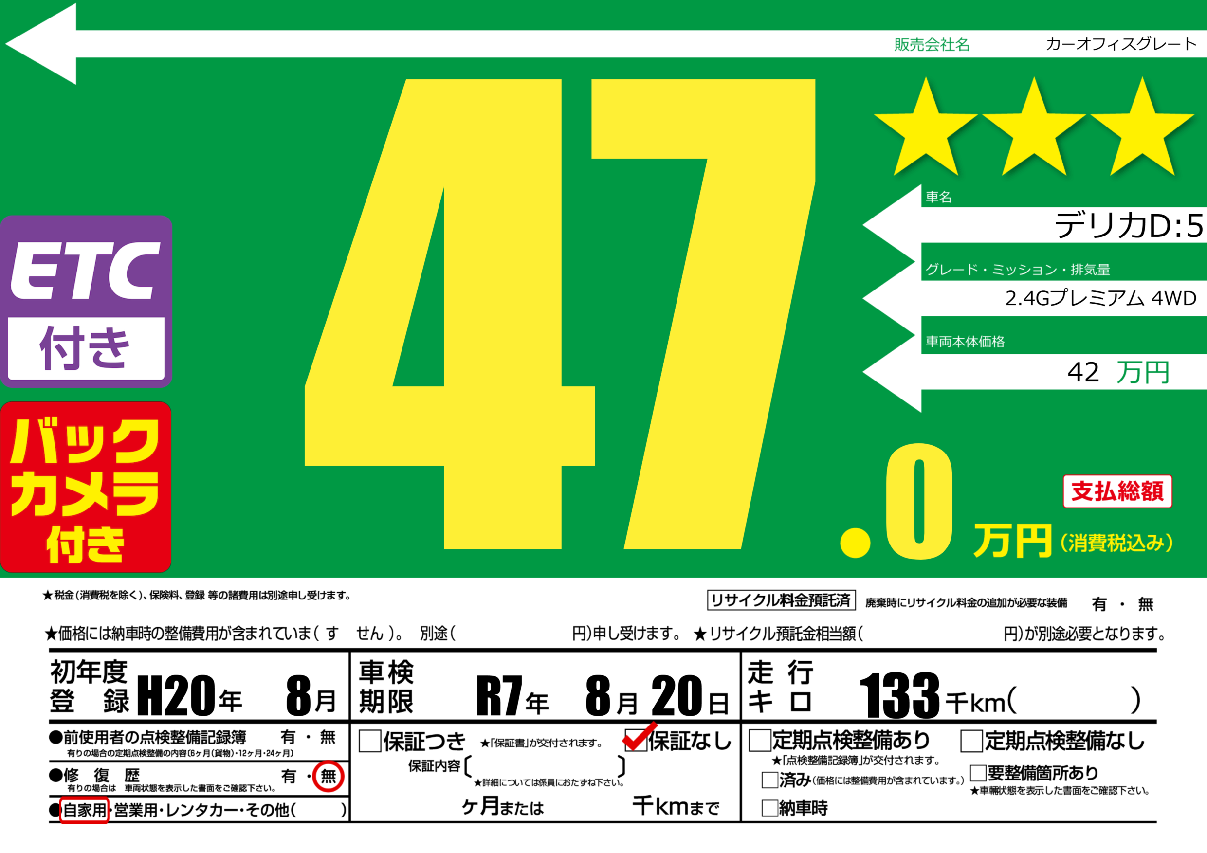 | 車名 | デリカD:5 | グレード ミッション 排気量 |