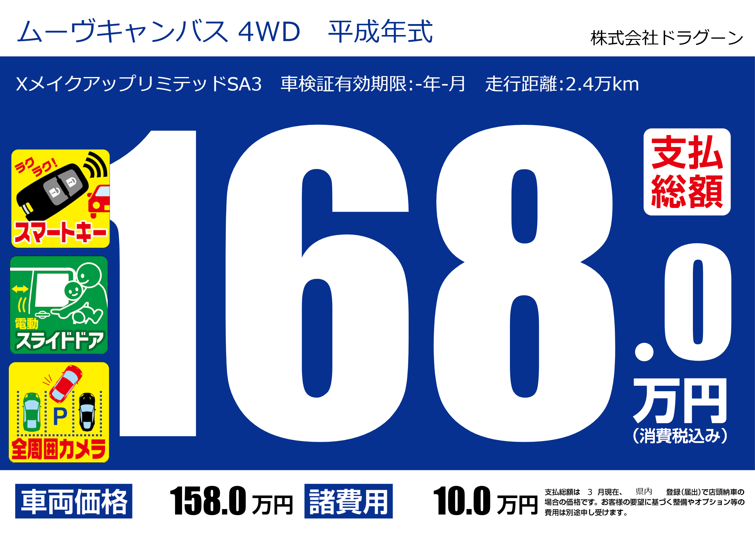 | 車名 | ムーヴキャンバス 4WD 平成年式 | グレード ミッション 排気量 |