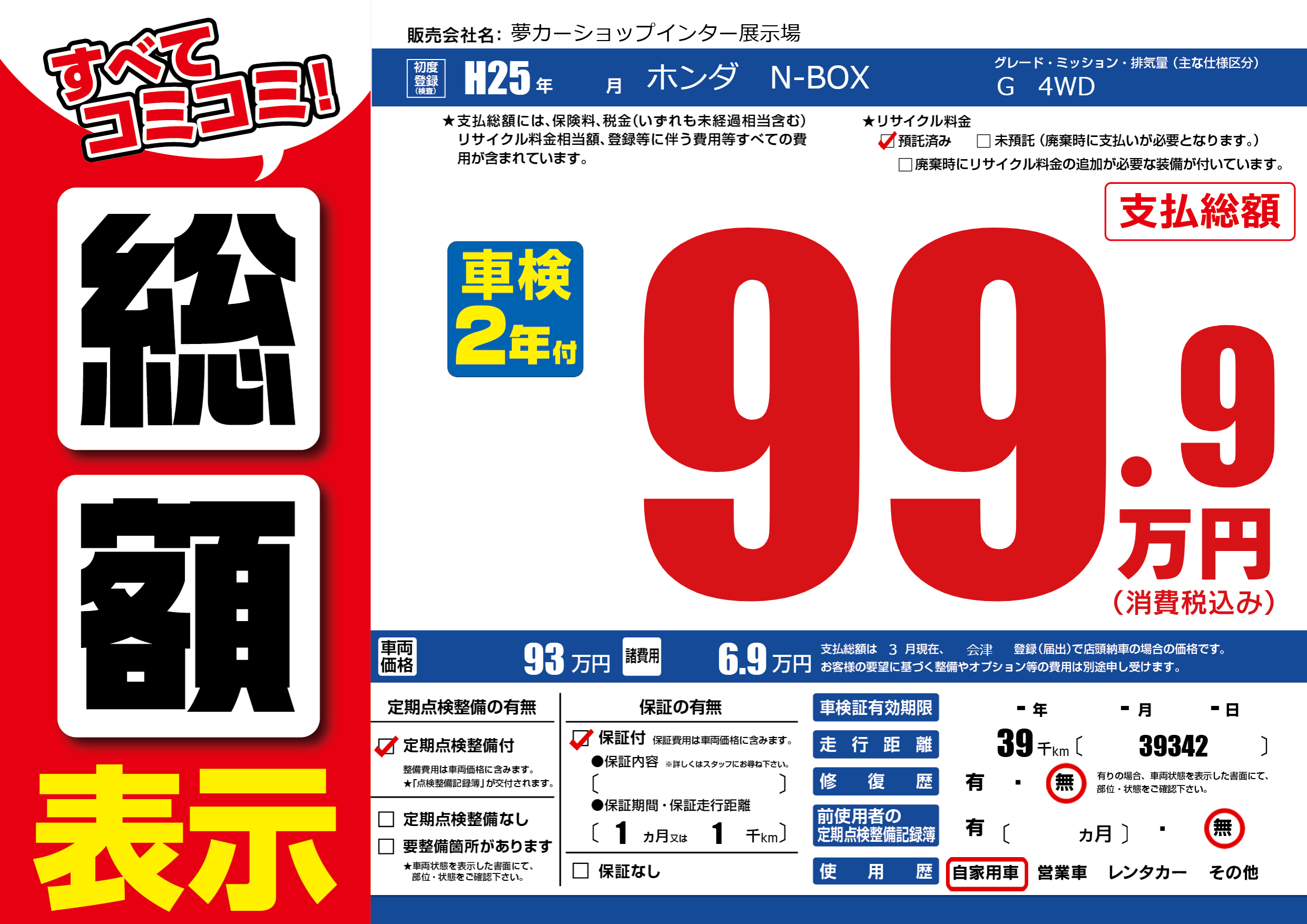 | 車名 | ホンダ N-BOX | グレード ミッション 排気量 |