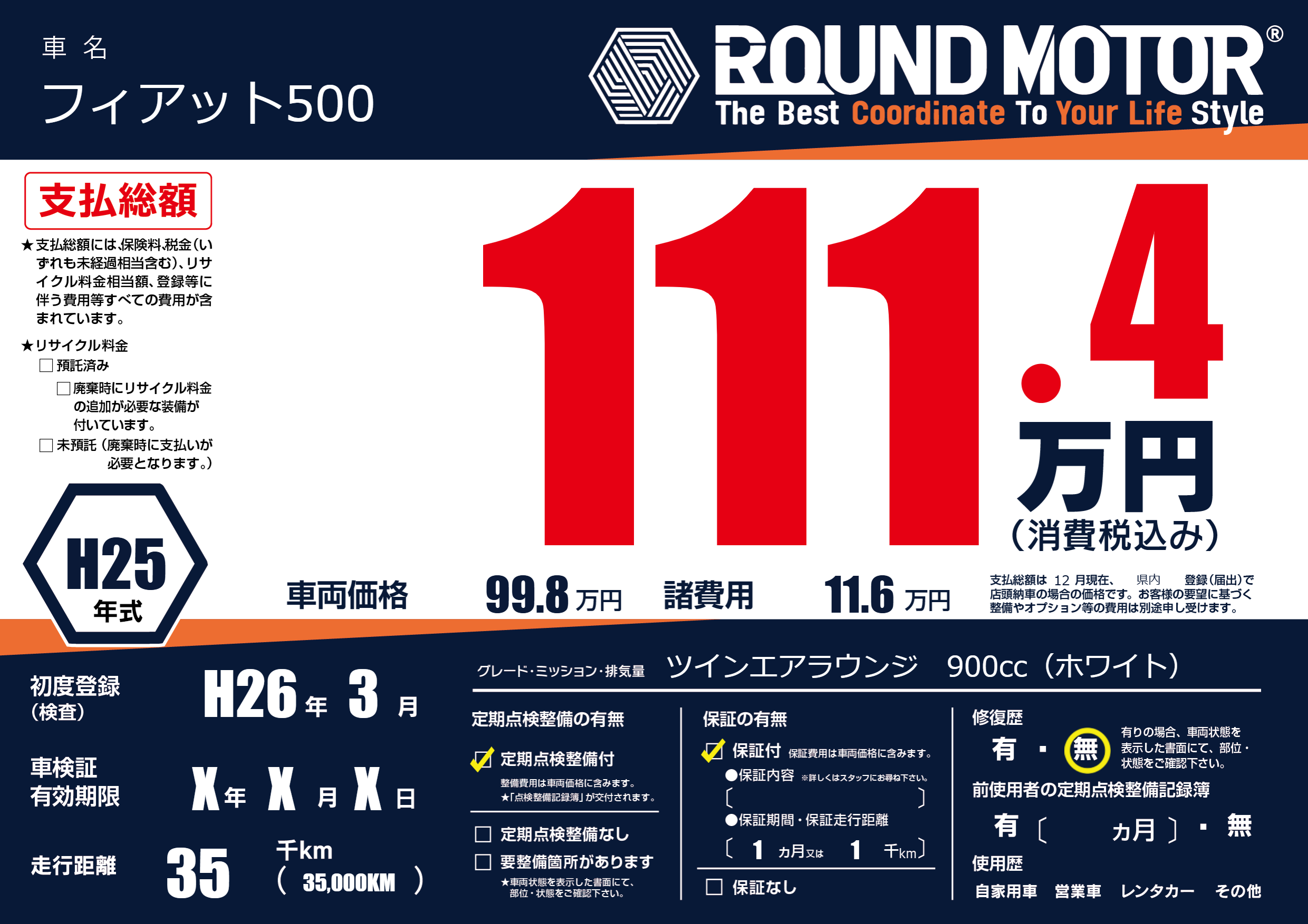 | 車名 | フィアット500 | グレード ミッション 排気量 |