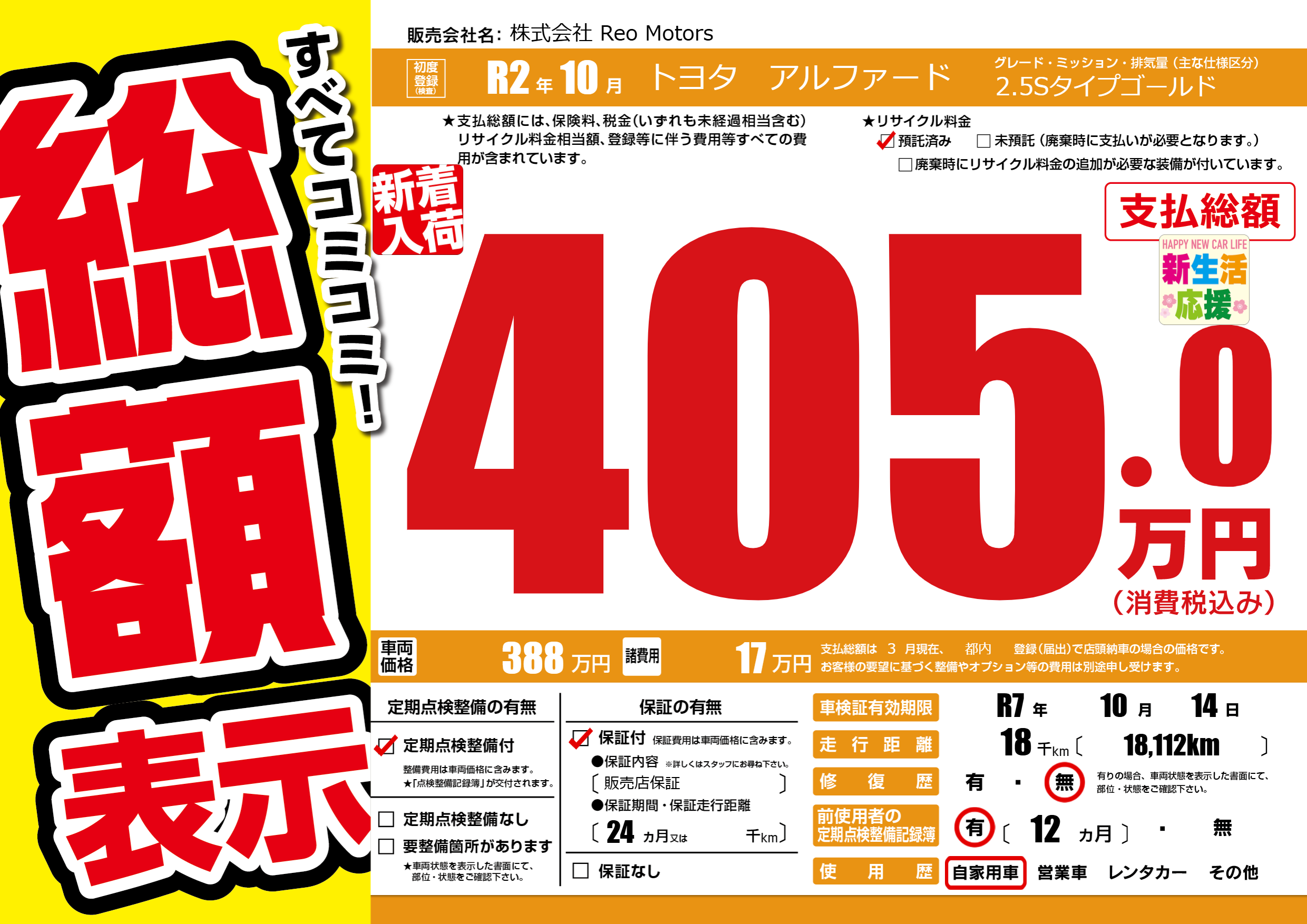 | 車名 | トヨタ アルファード | グレード ミッション 排気量 |