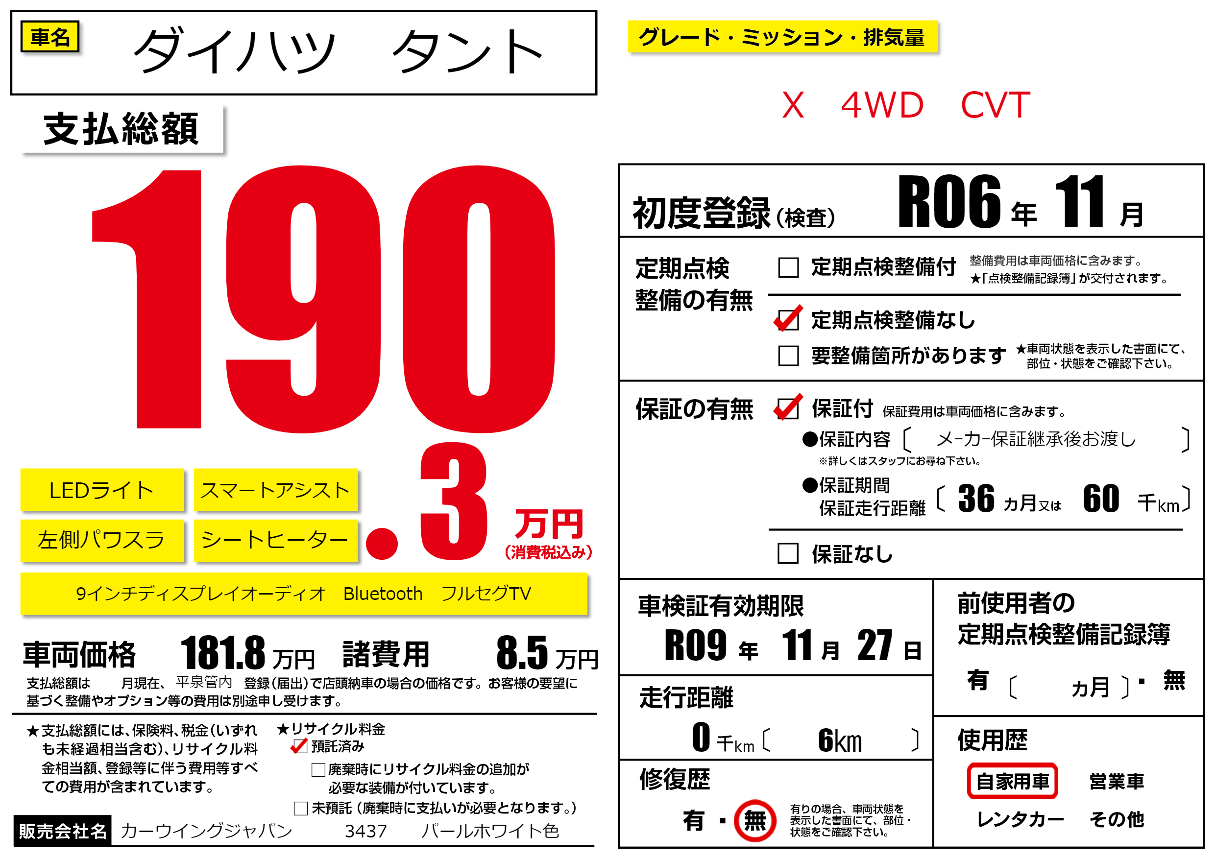 | 走行キロ | - | 初年度登録 | R06年11月 |
