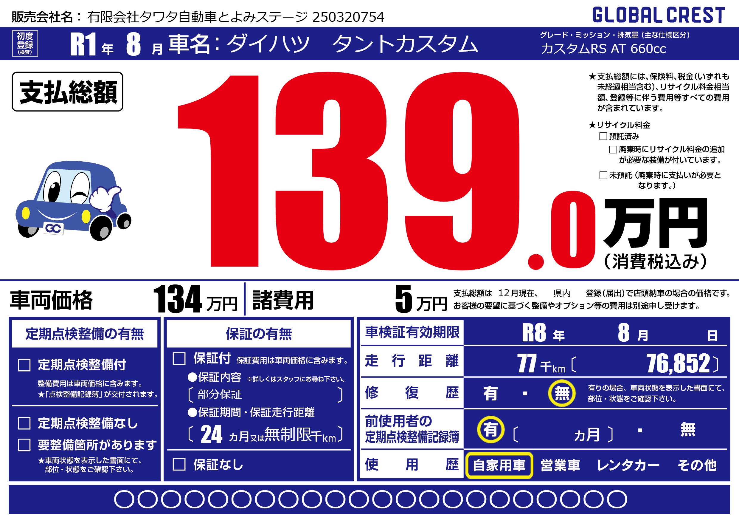 | 車名 | ダイハツ タントカスタム | グレード ミッション 排気量 |