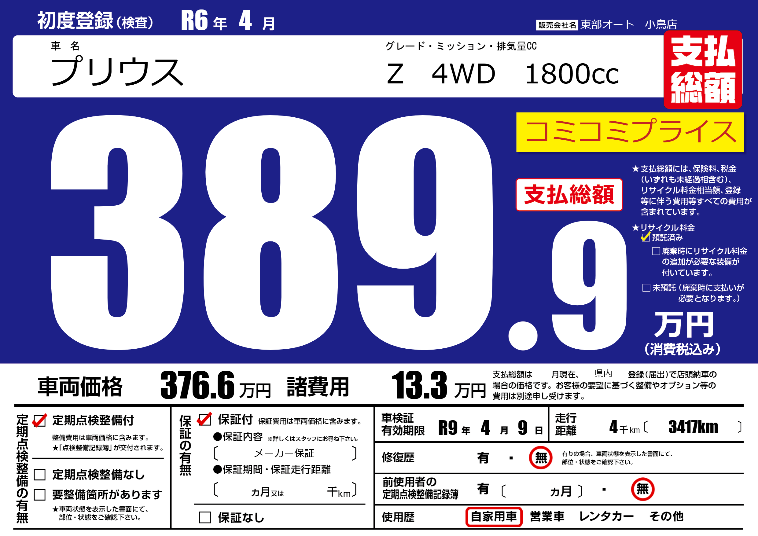 | 車名 | プリウス | グレード ミッション 排気量 |