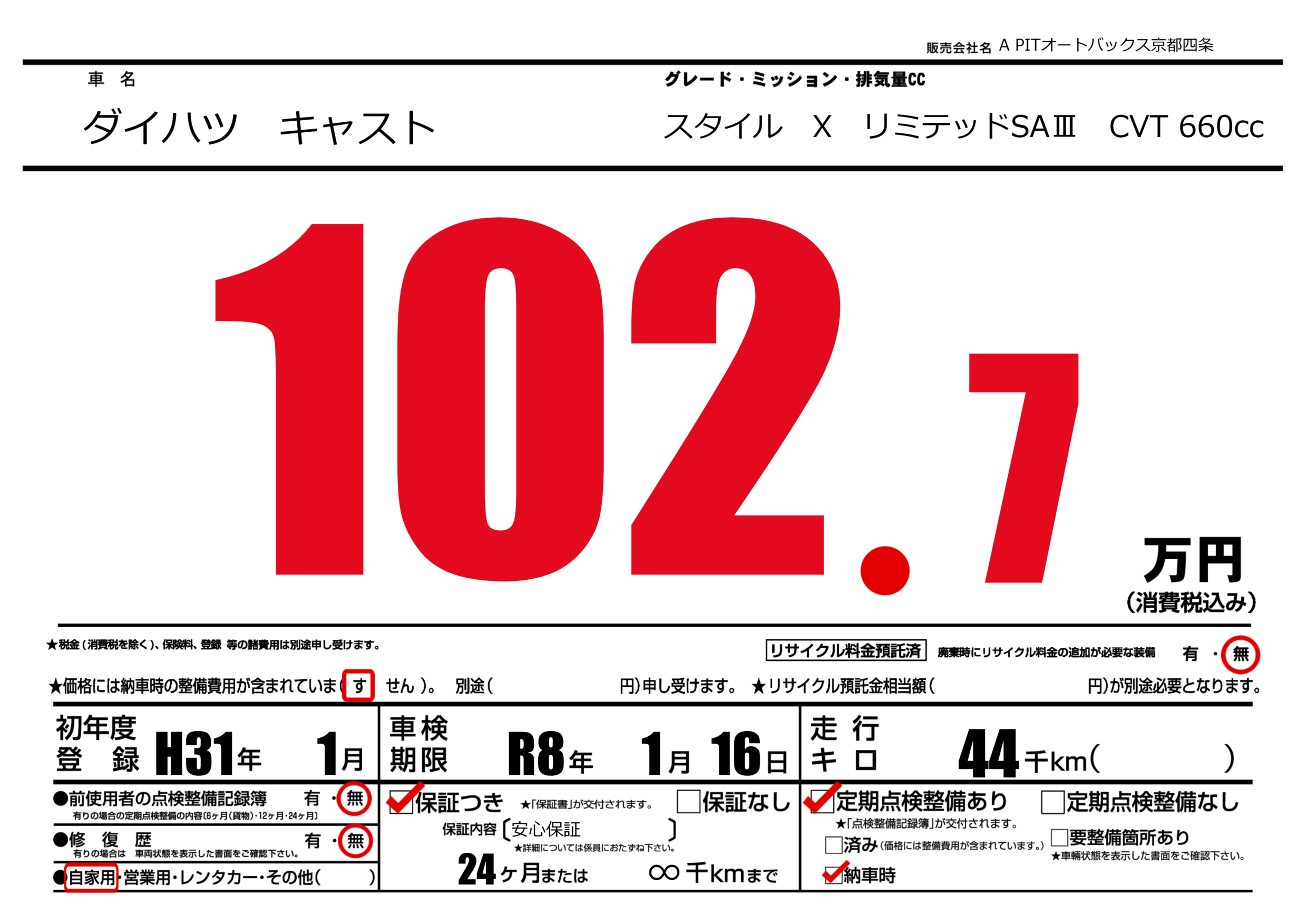 保証なし 保証内容(安心保証) 24ヶ月または(∞)千kmまで |