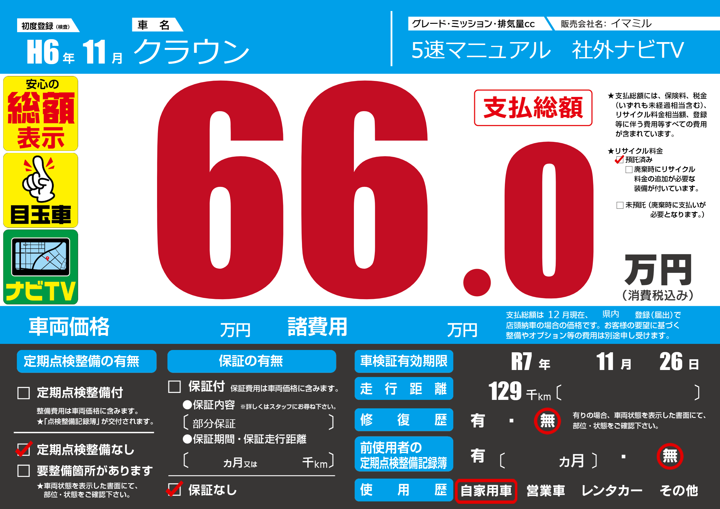 | 走行キロ | 12.9万km | 初年度登録 | H6年11月 |
