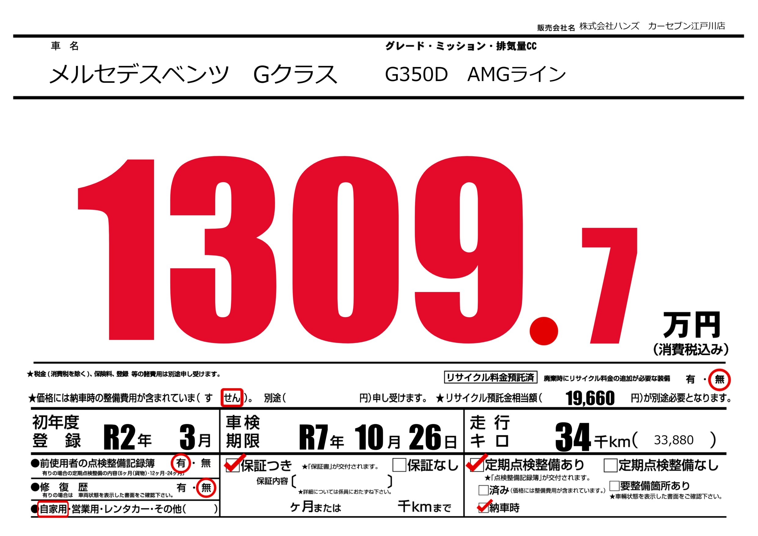 | 車名 | メルセデスベンツ Gクラス | グレード ミッション 排気量 |
