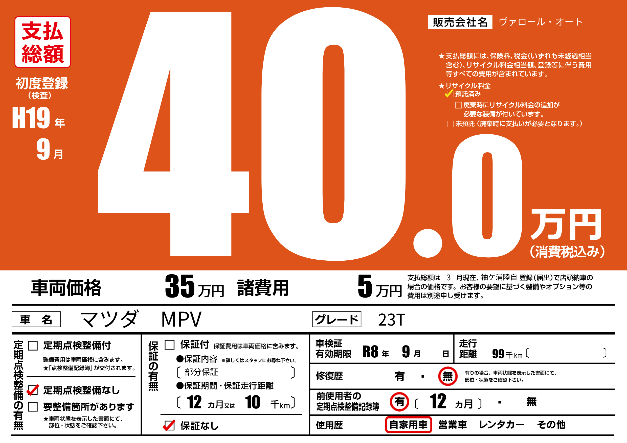 | 車検制限 | R8年 9月 - 日 | ||