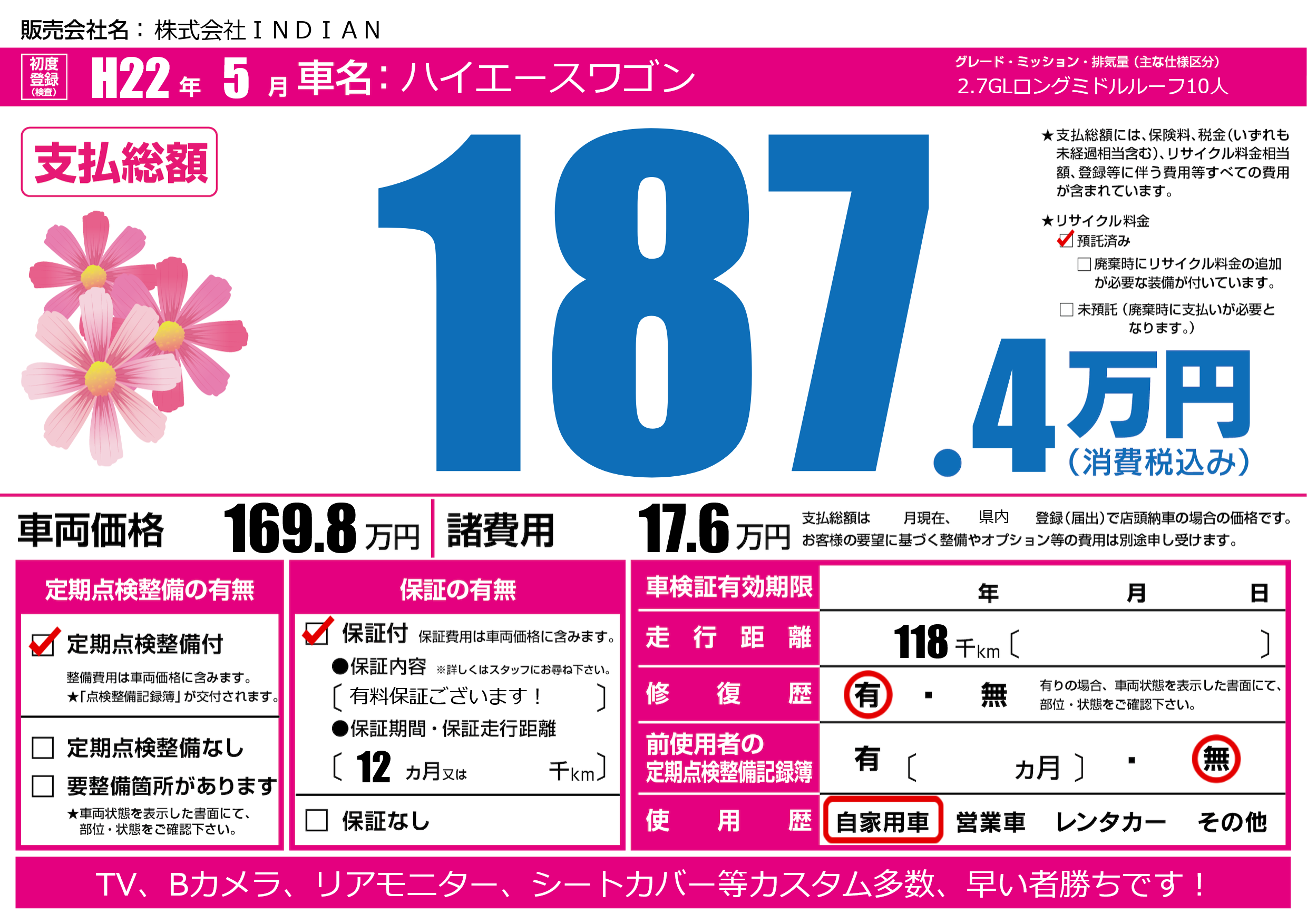 | 車名 | ハイエースワゴン | グレード ミッション 排気量 |