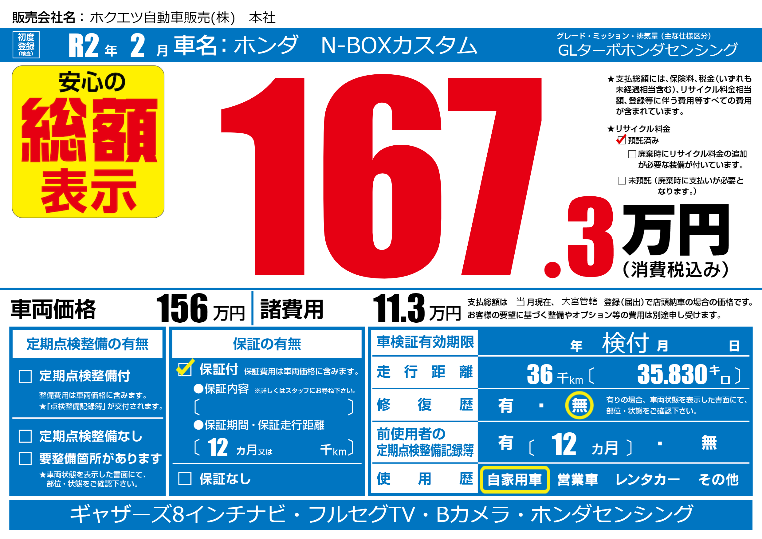 | 車名 | ホンダ N‐BOXカスタム | グレード ミッション 排気量 |