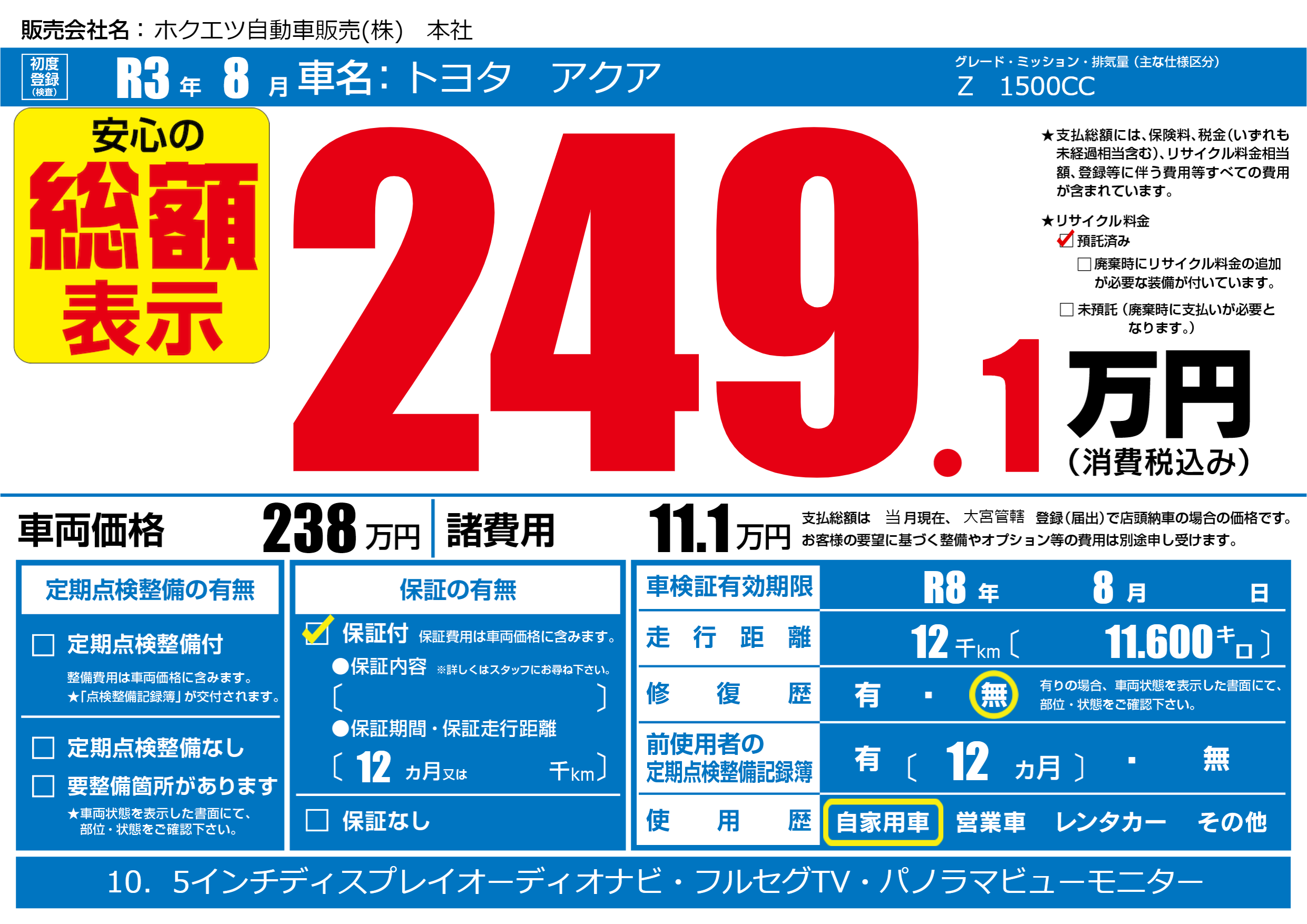 | 走行キロ | 1.2万km | 初年度登録 | R3年8月 |