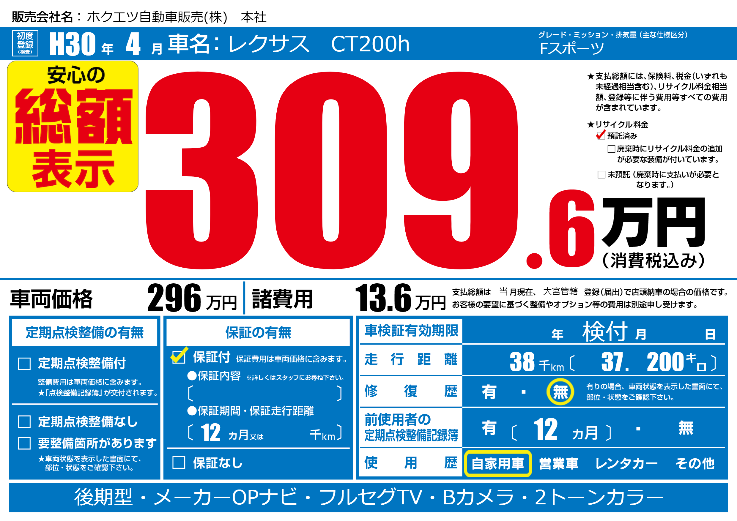 | 走行キロ | 3.8万km | 初年度登録 | H30年4月 |