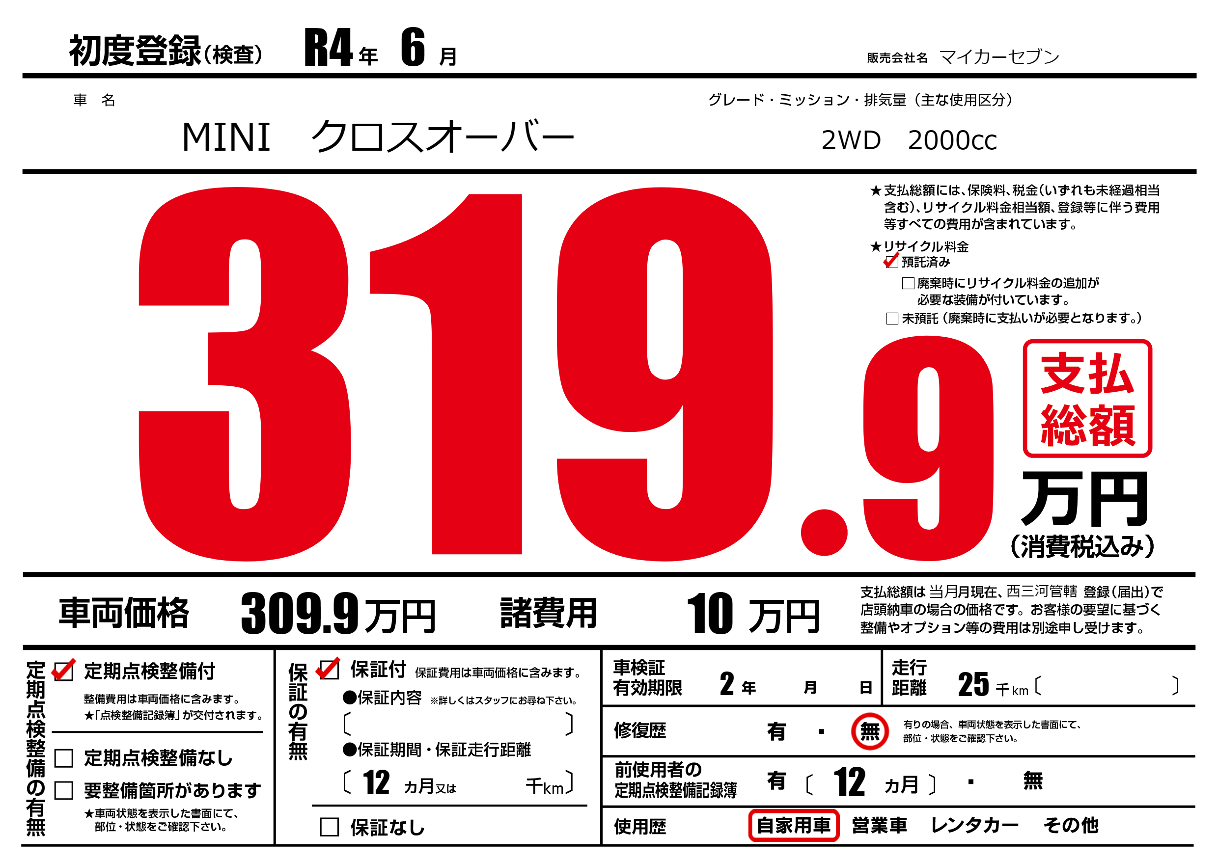 | 車名 | MINI クロスオーバー | グレード ミッション 排気量 |