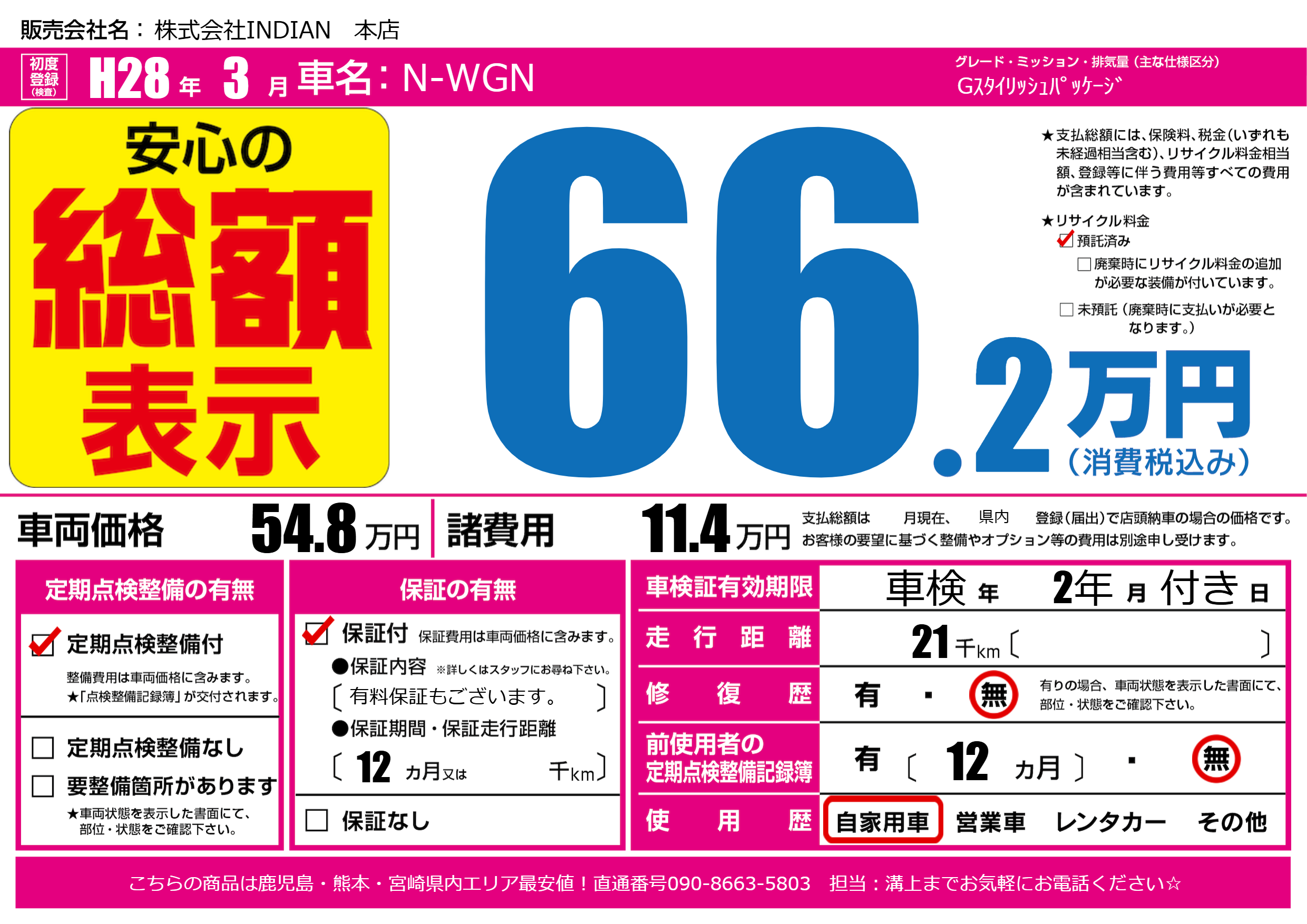 | 車名 | N-WGN | グレード ミッション 排気量 |