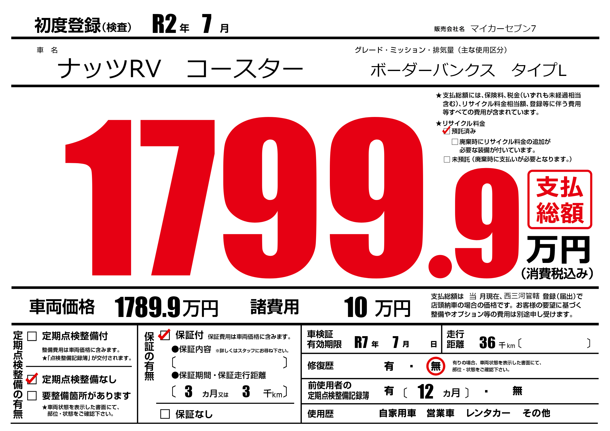| 車名 | ナッツRV コースター | グレード ミッション 排気量 |