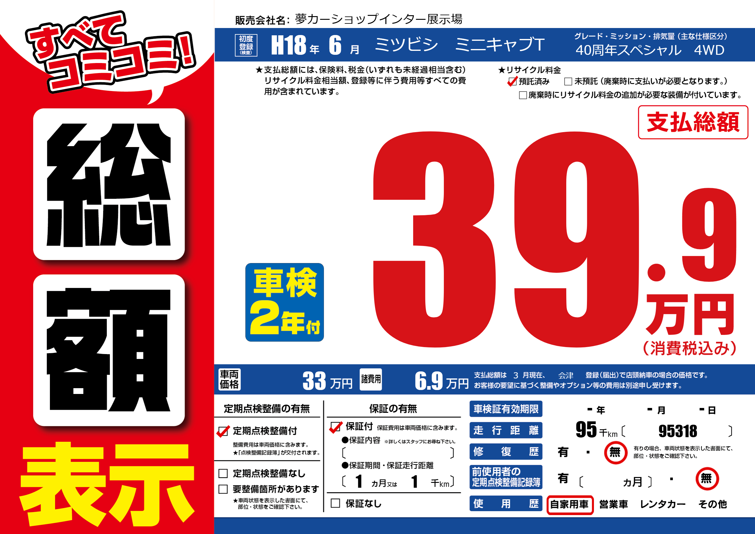 | 走行キロ | 9.5万km | 初年度登録 | H18年6月 |