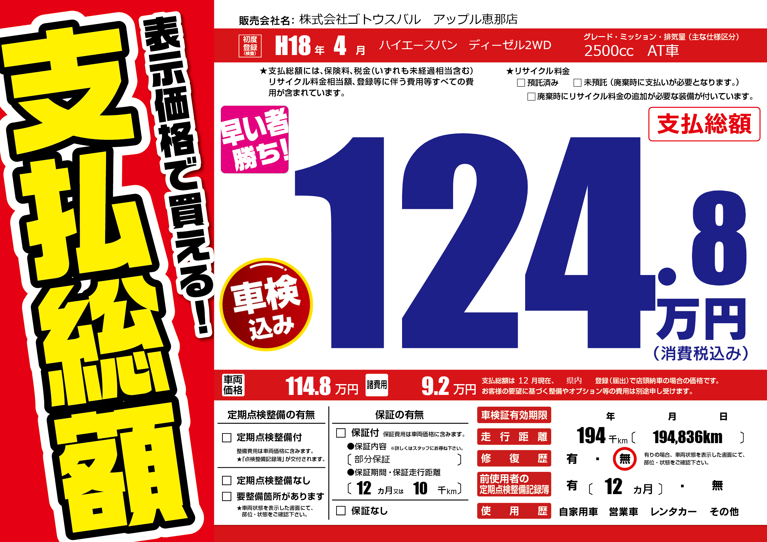 | 走行キロ | 19.4万km | 初年度登録 | H18年4月 |