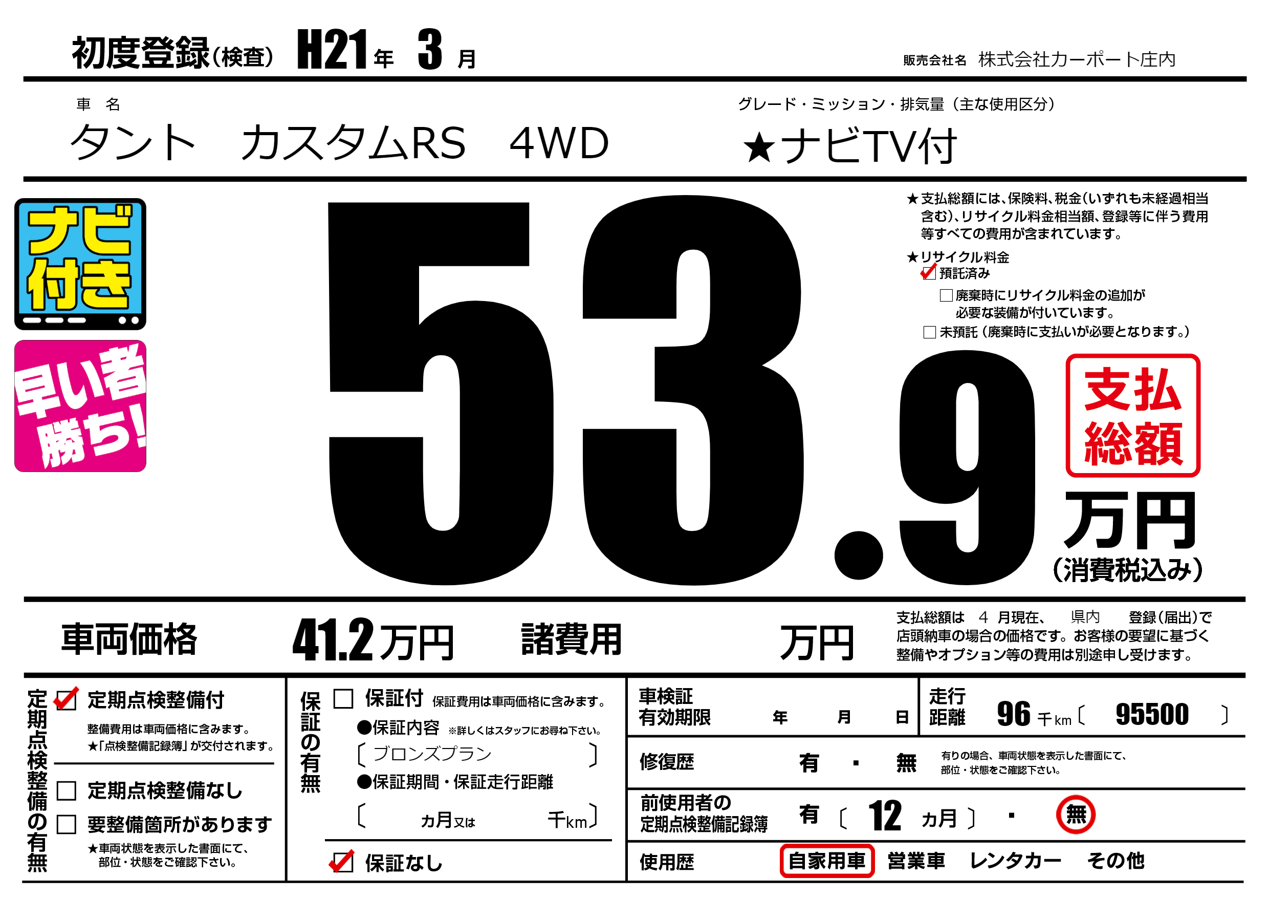 | 車名 | タント カスタムRS 4WD | グレード ミッション 排気量 |