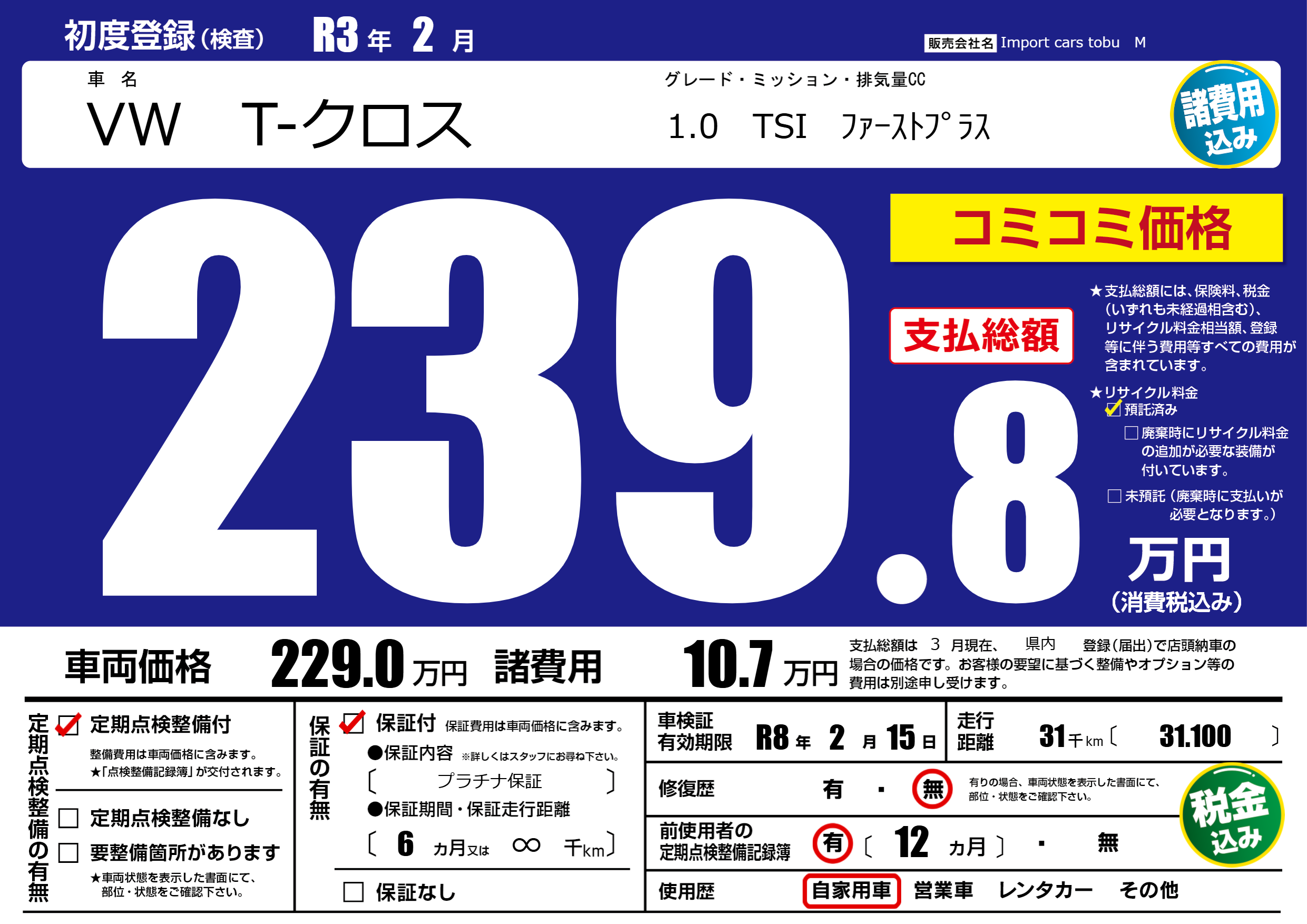 | 車名 | VW T-クロス | グレード ミッション 排気量 |