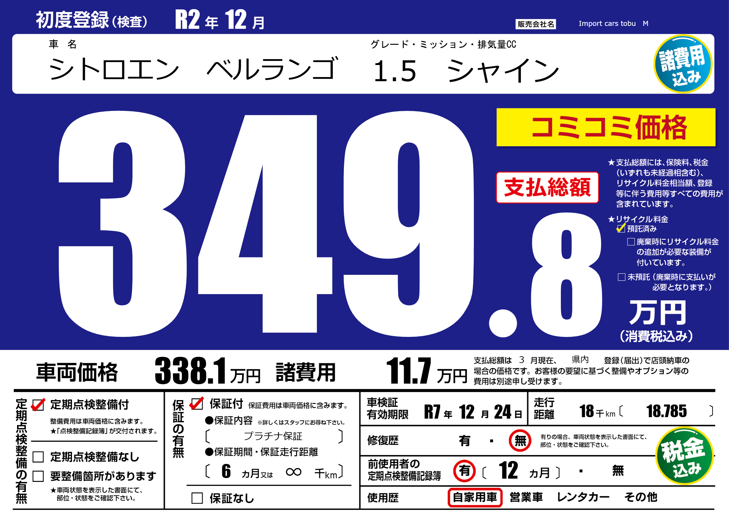| 車名 | シトロエン ベルランゴ | グレード ミッション 排気量 |