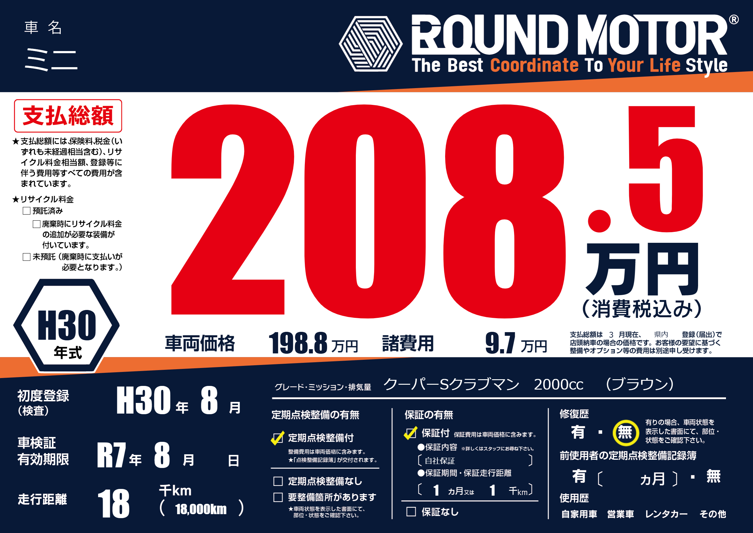 | 車名 | ミニ | グレード ミッション 排気量 |