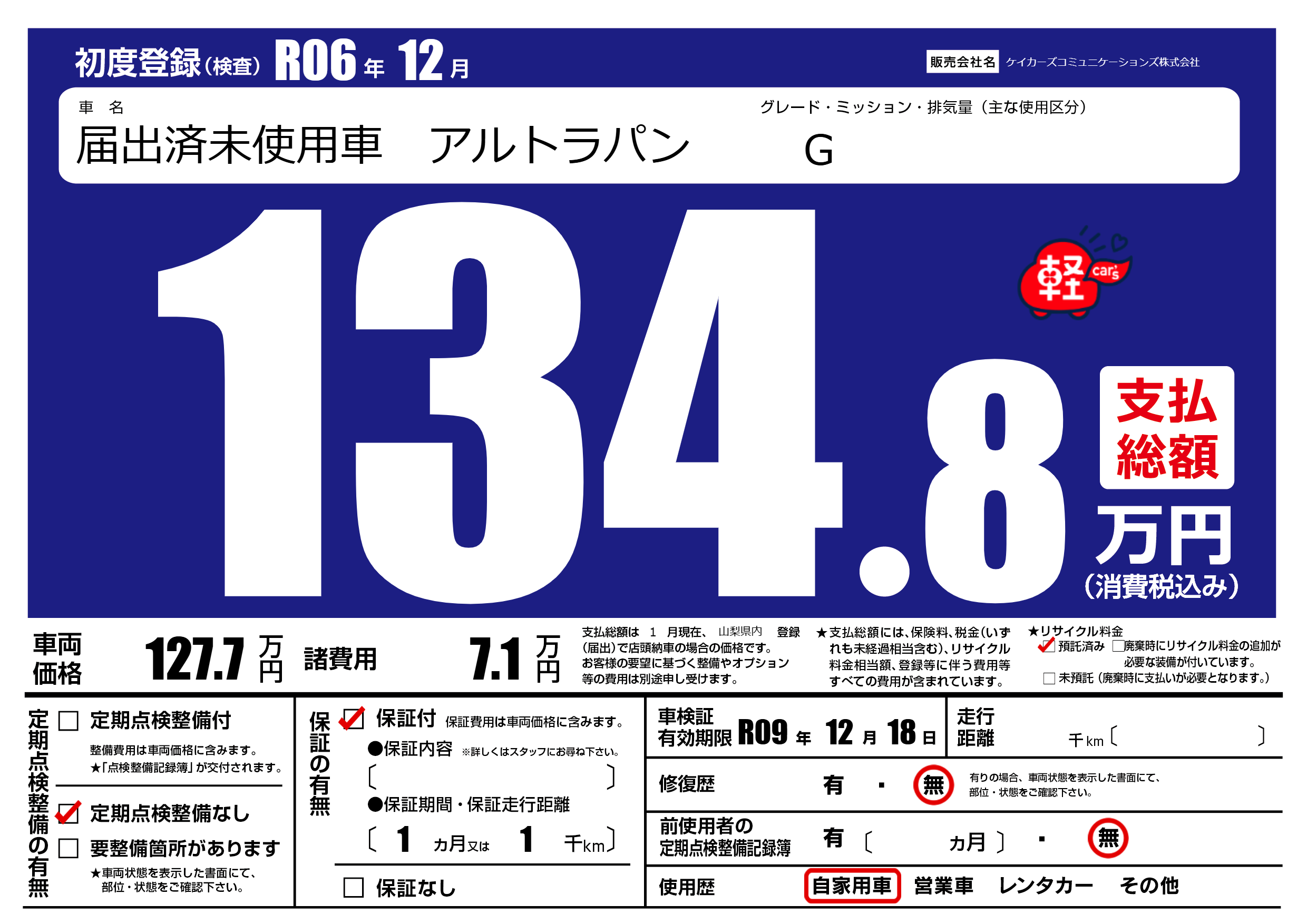 | 走行キロ | - | 初年度登録 | R06年12月 |