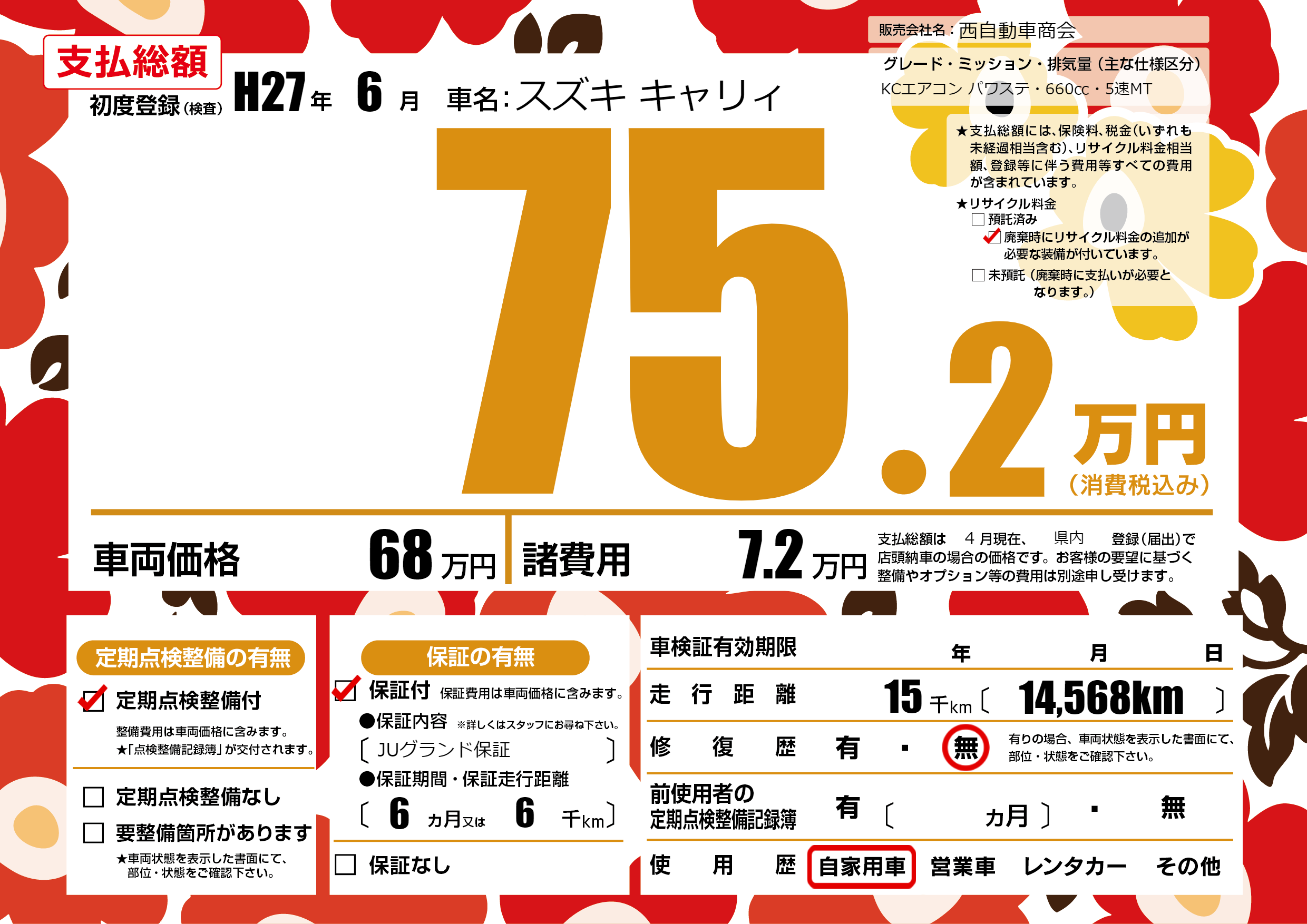 保証付き 保証内容(JUグランド保証) 6ヶ月または6千km |