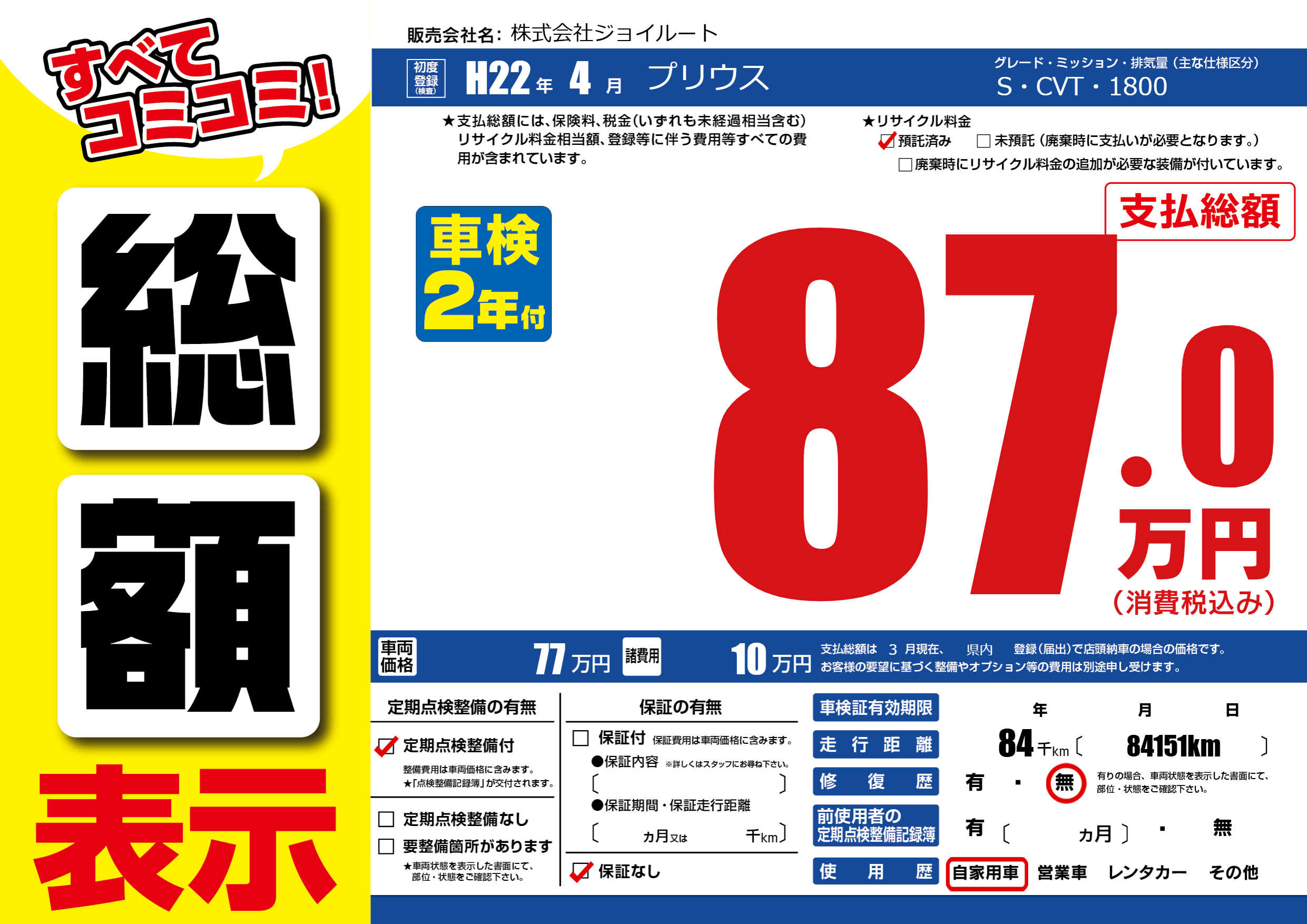 | 車検制限 | - 年 - 月 - 日 | ||