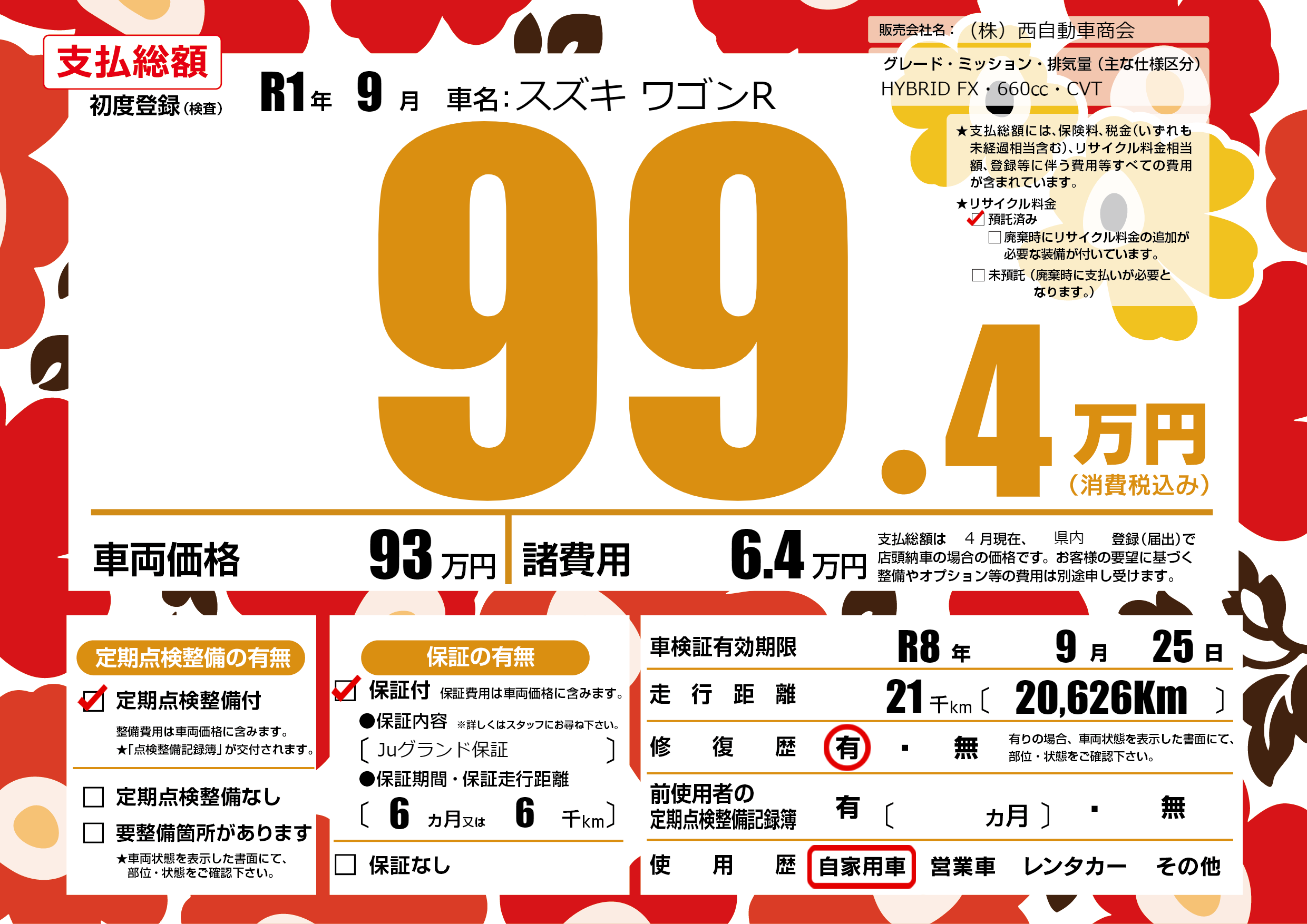 | 車名 | スズキ ワゴンR | グレード ミッション 排気量 |