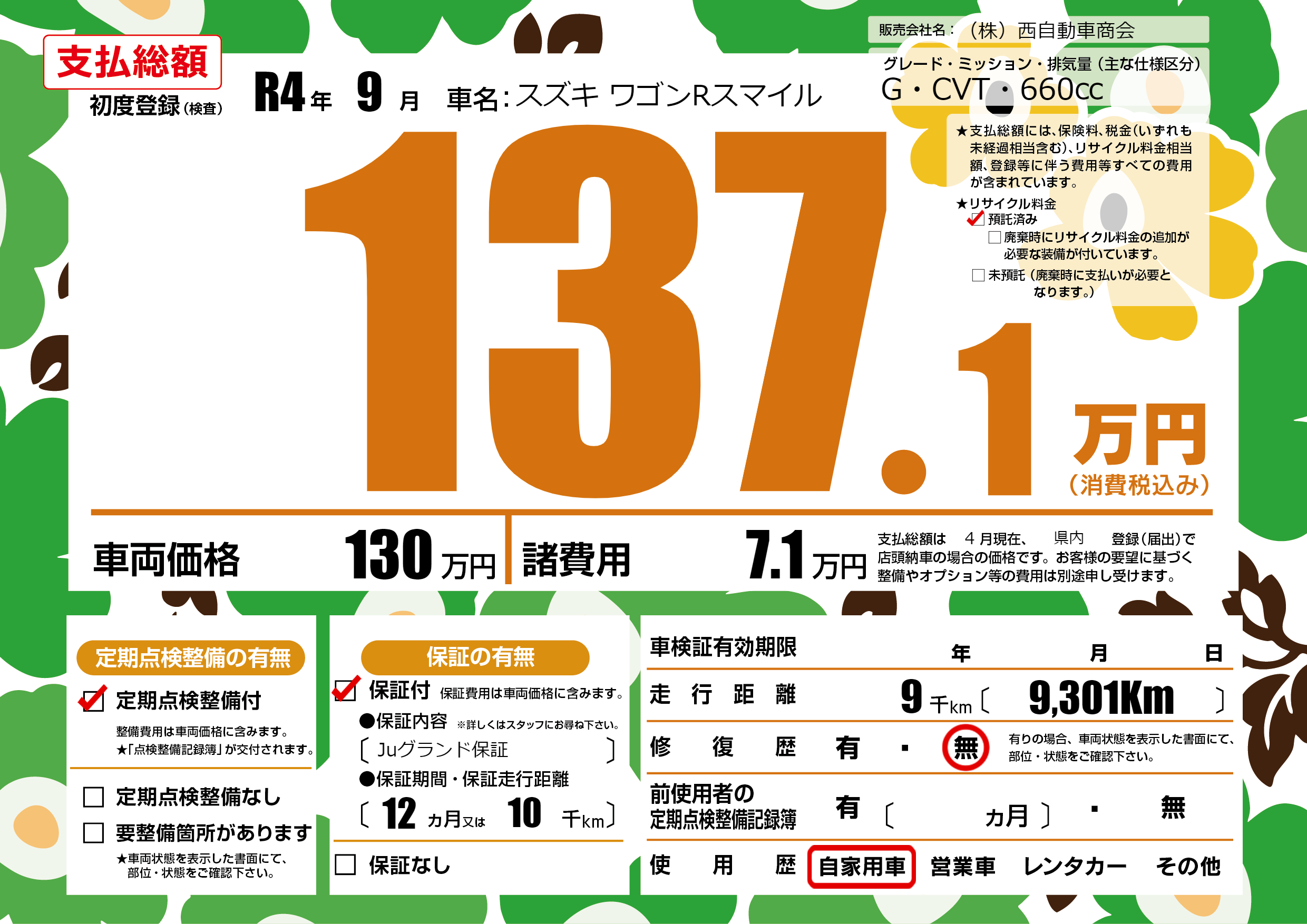 | 走行キロ | 0.9万km | 初年度登録 | R4年9月 |