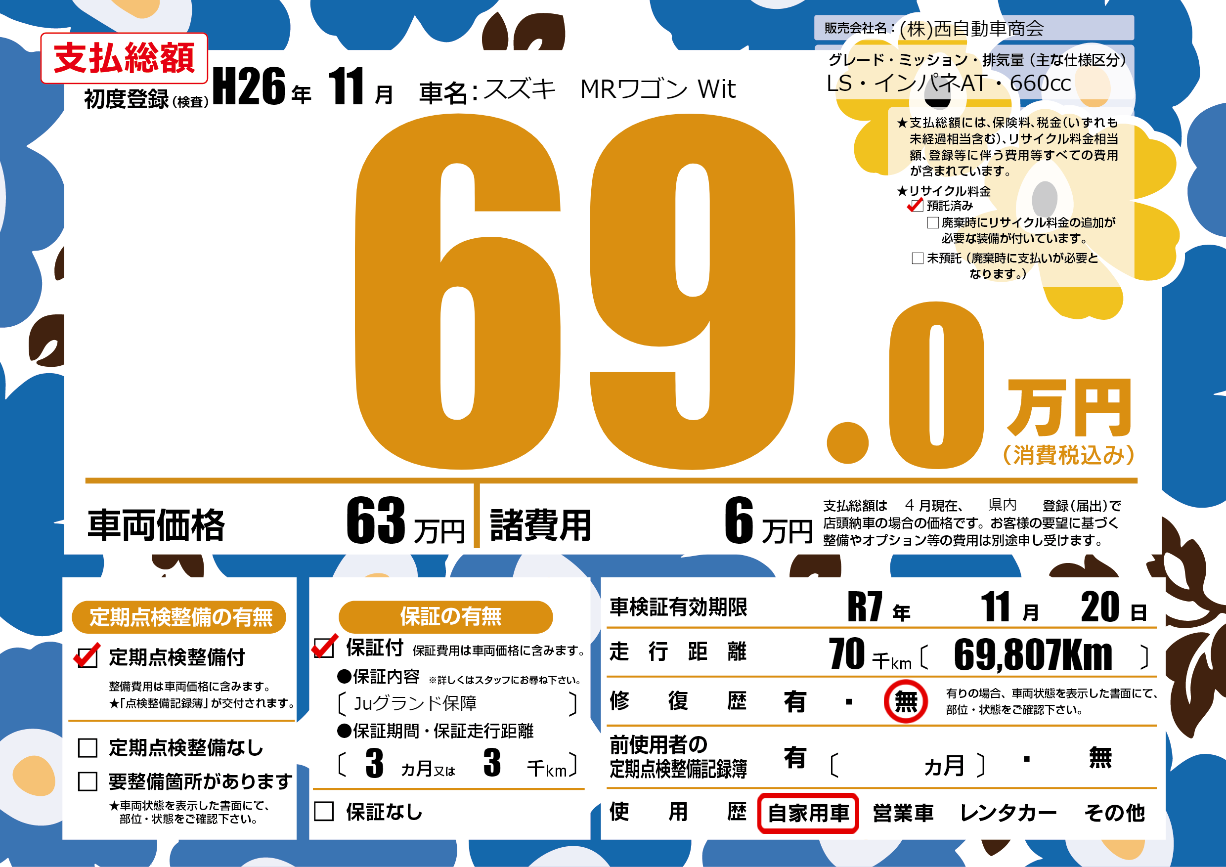 | 車検制限 | R7年 11月 20日 | ||