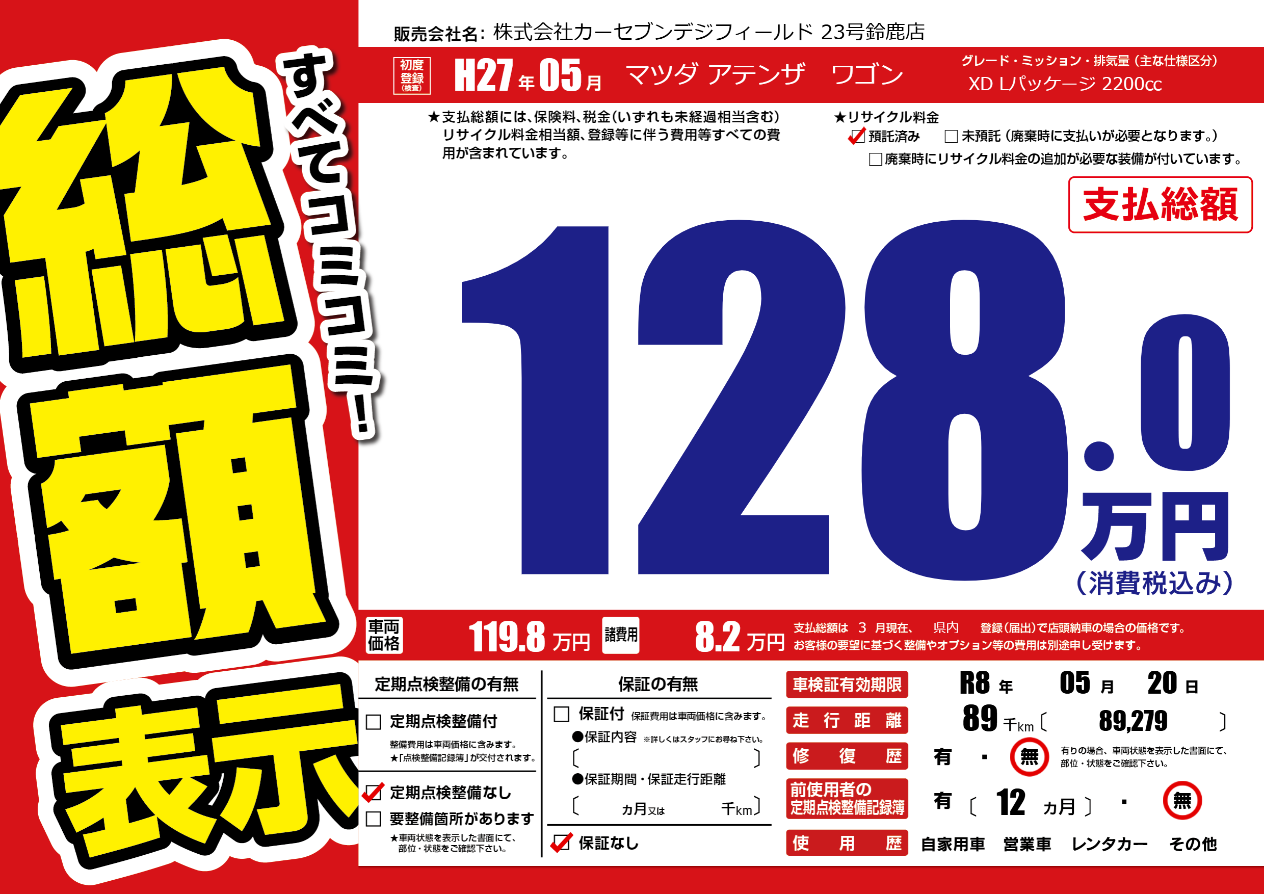 | 走行キロ | 8.9万km | 初年度登録 | H27年05月 |