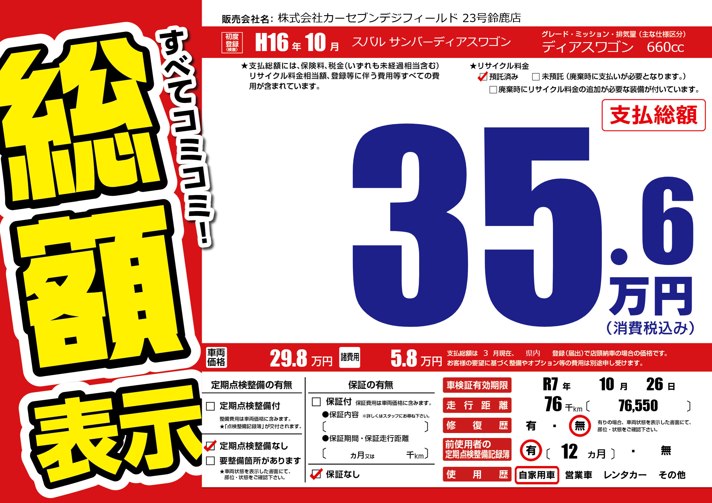 | 走行キロ | 7.6万km | 初年度登録 | H16年10月 |