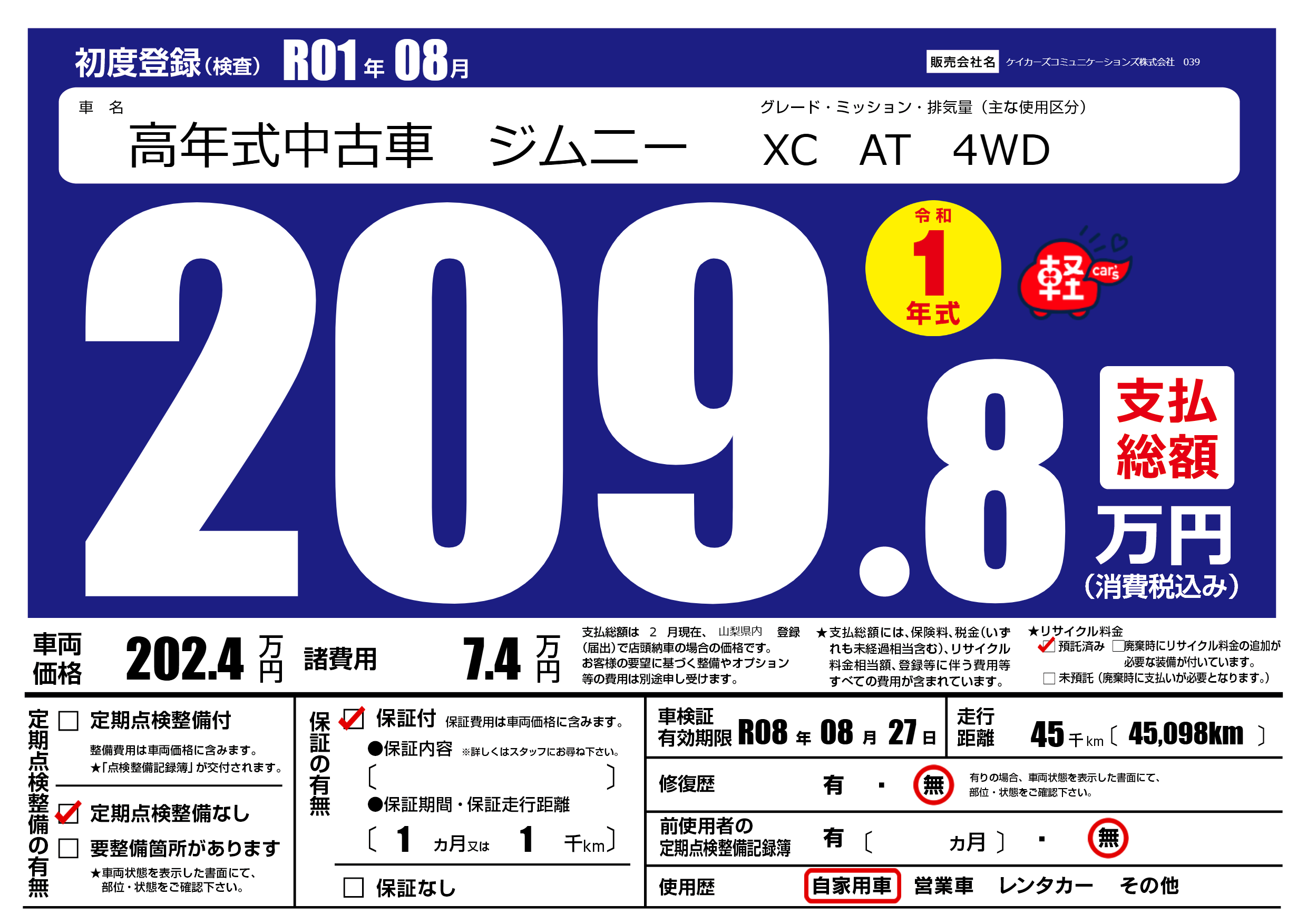 | 走行キロ | 4.5万km | 初年度登録 | R01年08月 |