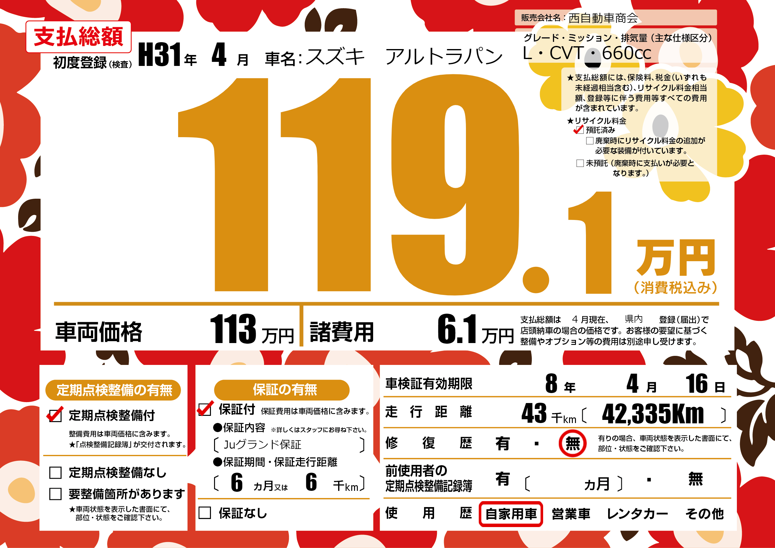 | 走行キロ | 4.3万km | 初年度登録 | H31年4月 |
