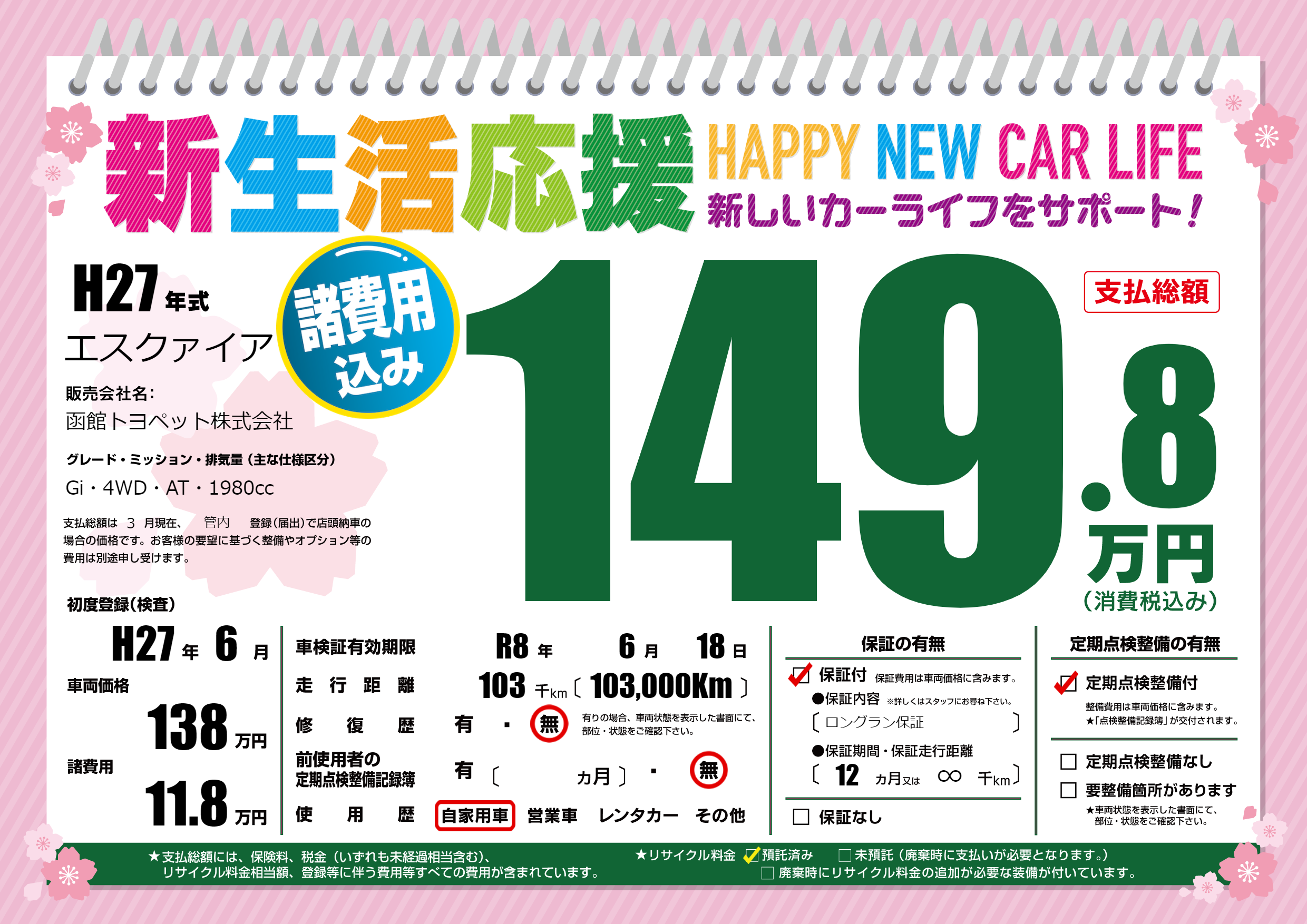 | 車名 | エスクァイア | グレード ミッション 排気量 |