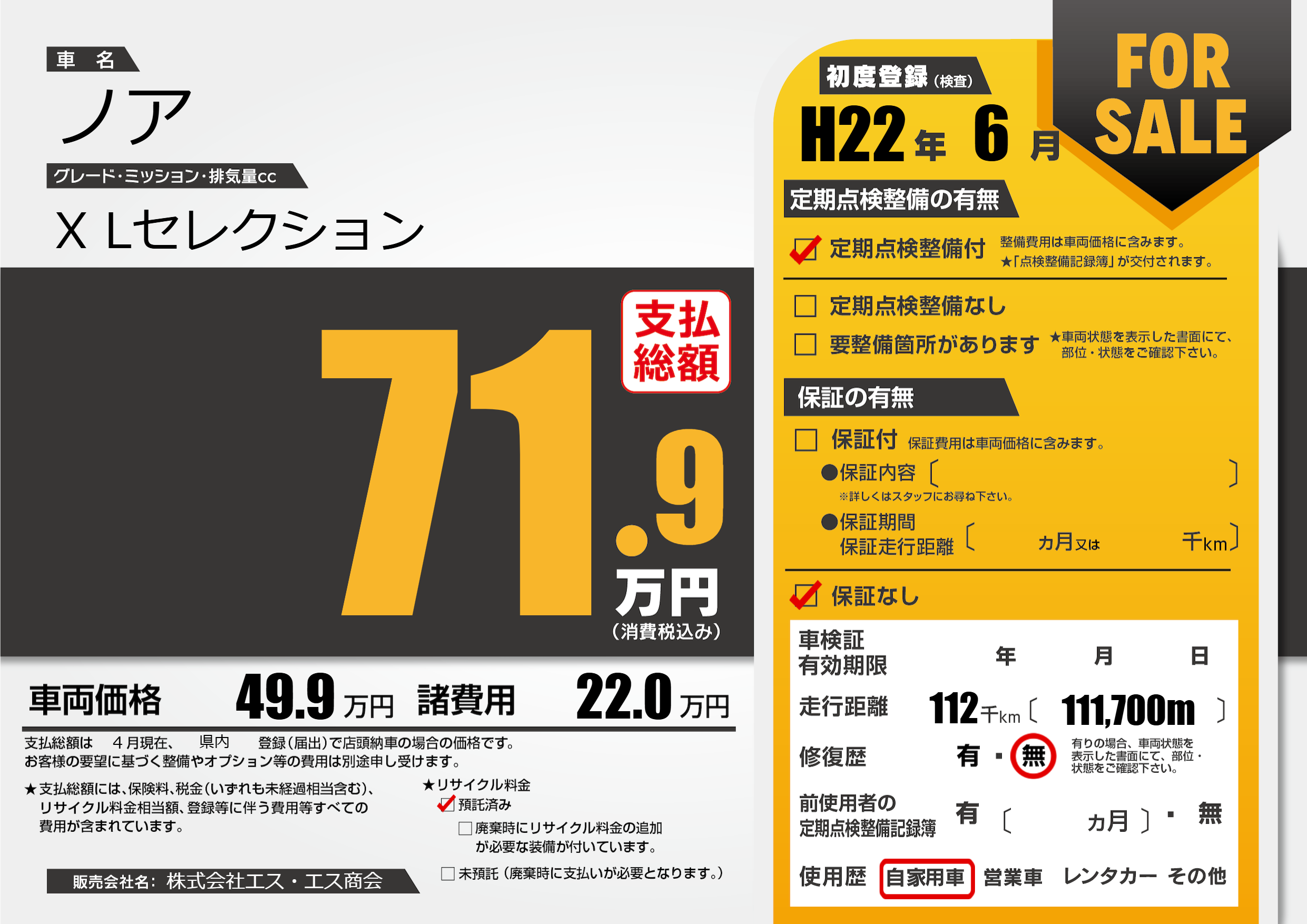 | 走行キロ | 11.2万km | 初年度登録 | H22年6月 |
