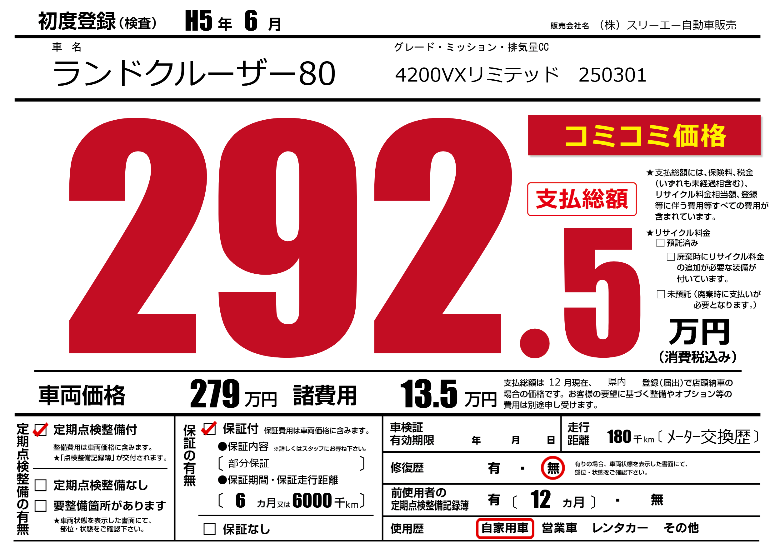 | 走行キロ | 18万km | 初年度登録 | H5年6月 |
