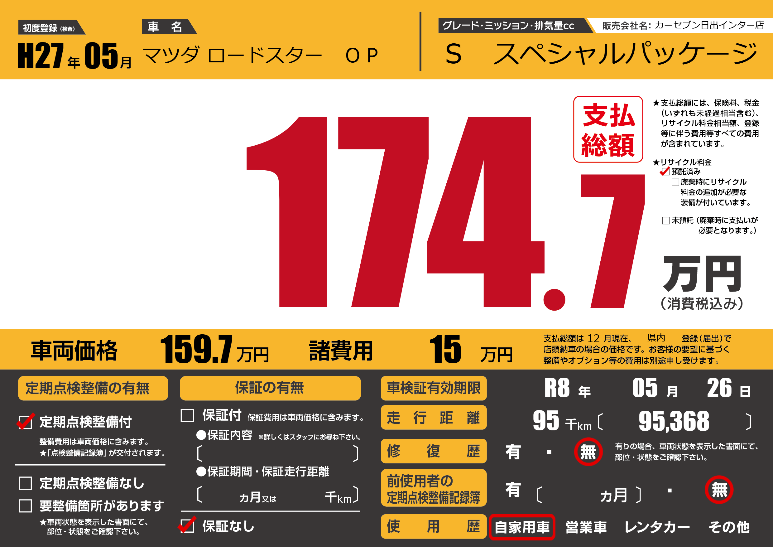| 走行キロ | 9.5万km | 初年度登録 | H27年05月 |