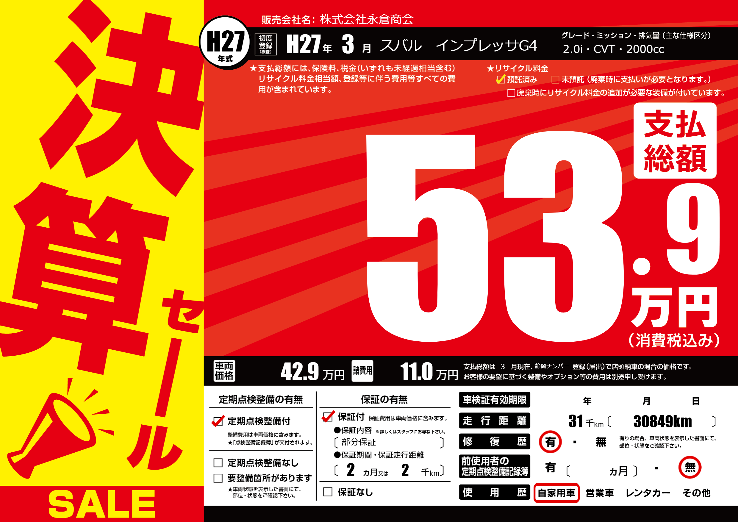 | 走行キロ | 3.1万km | 初年度登録 | H27年3月 |