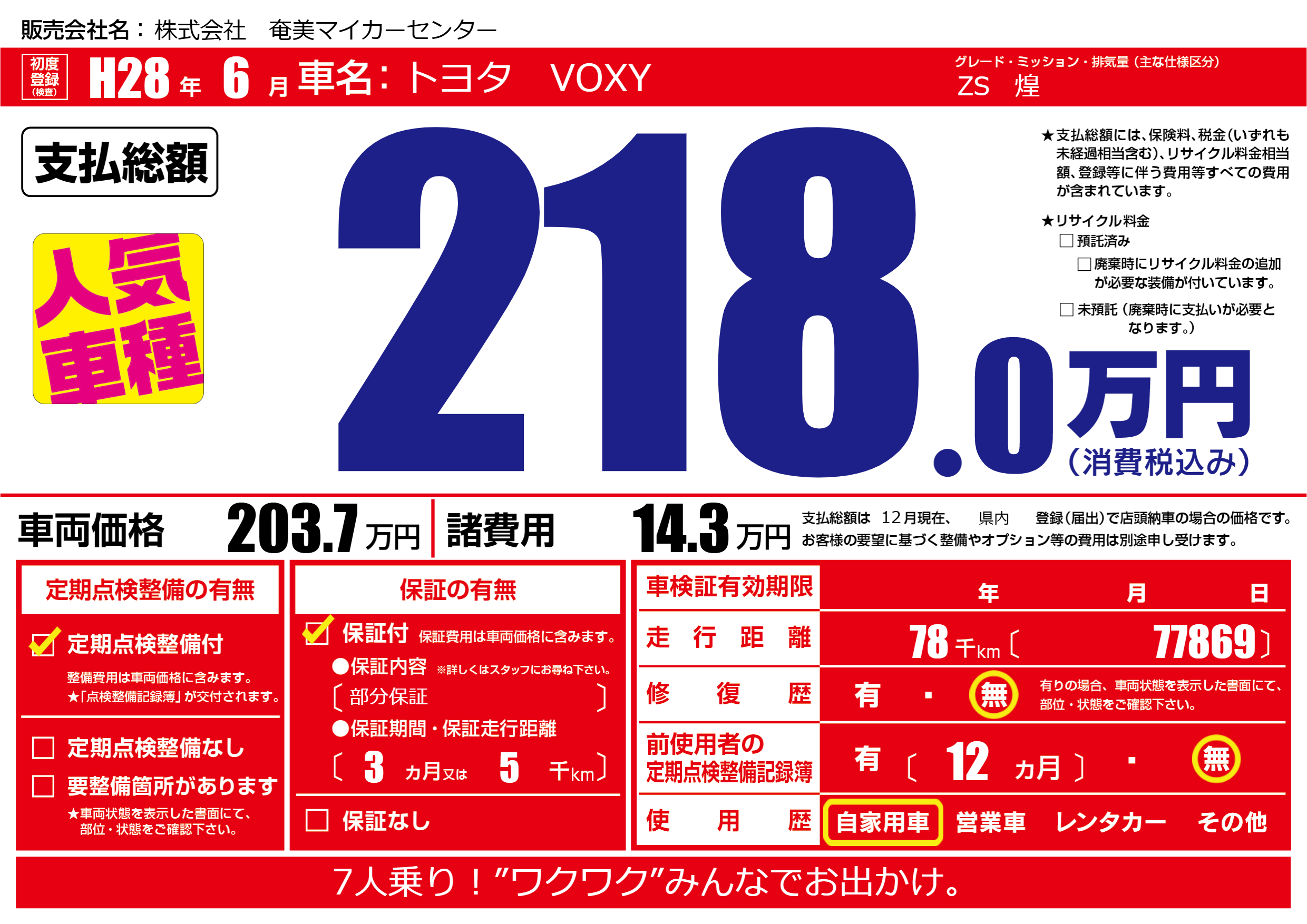 | 走行キロ | 7.8万km | 初年度登録 | H28年6月 |