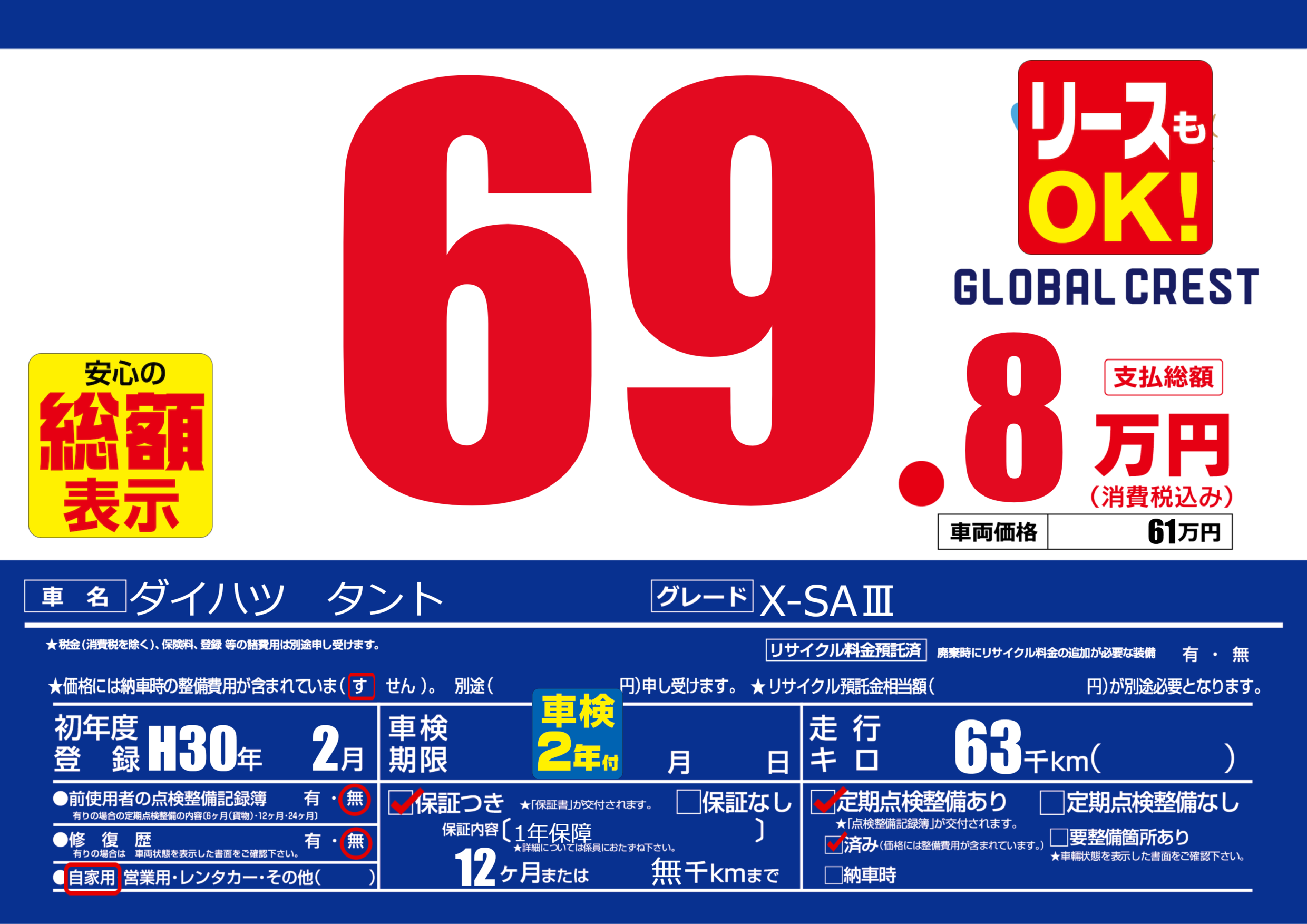 | 定期点検整備 | 定期点検整備あり 定期点検整備済み | ||
