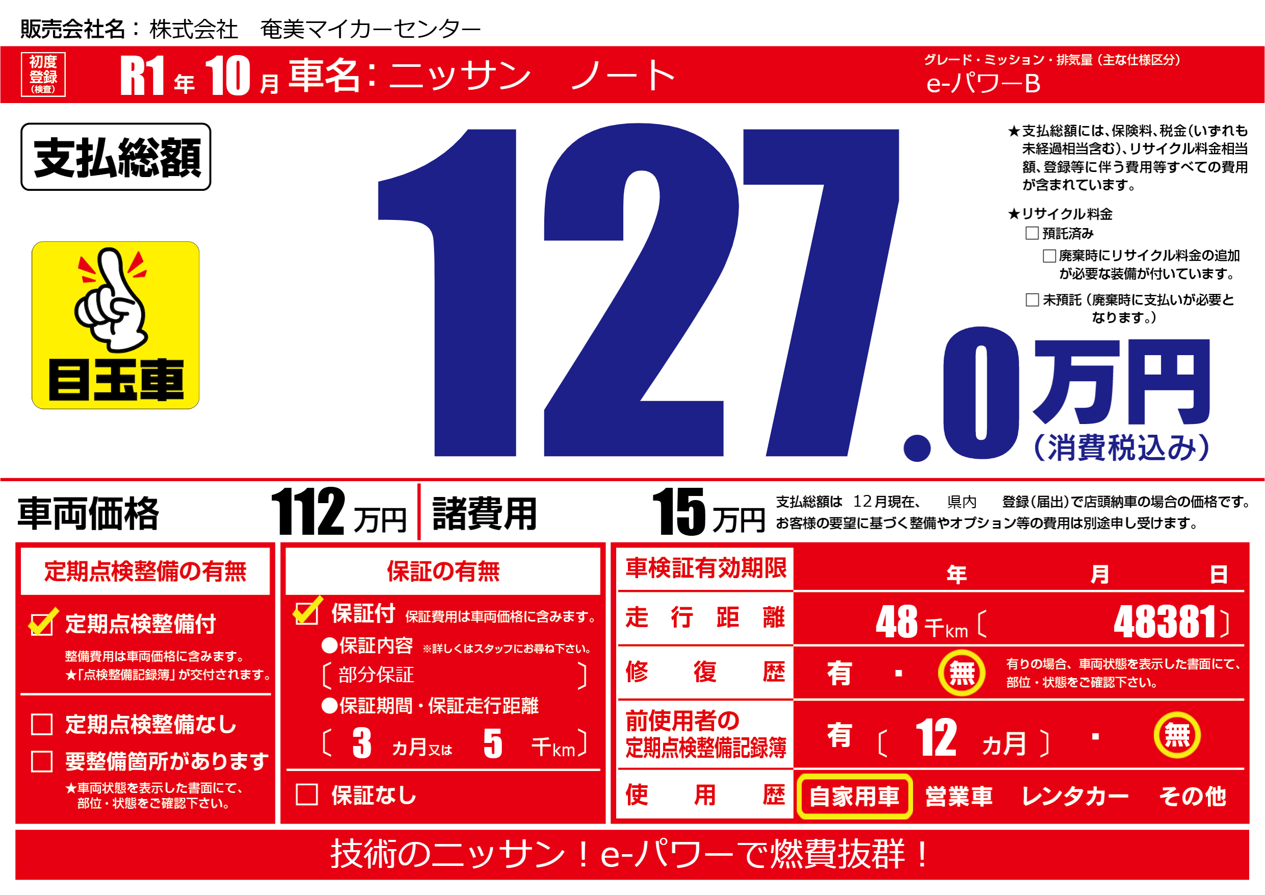 | 車名 | ニッサン ノート | グレード ミッション 排気量 |