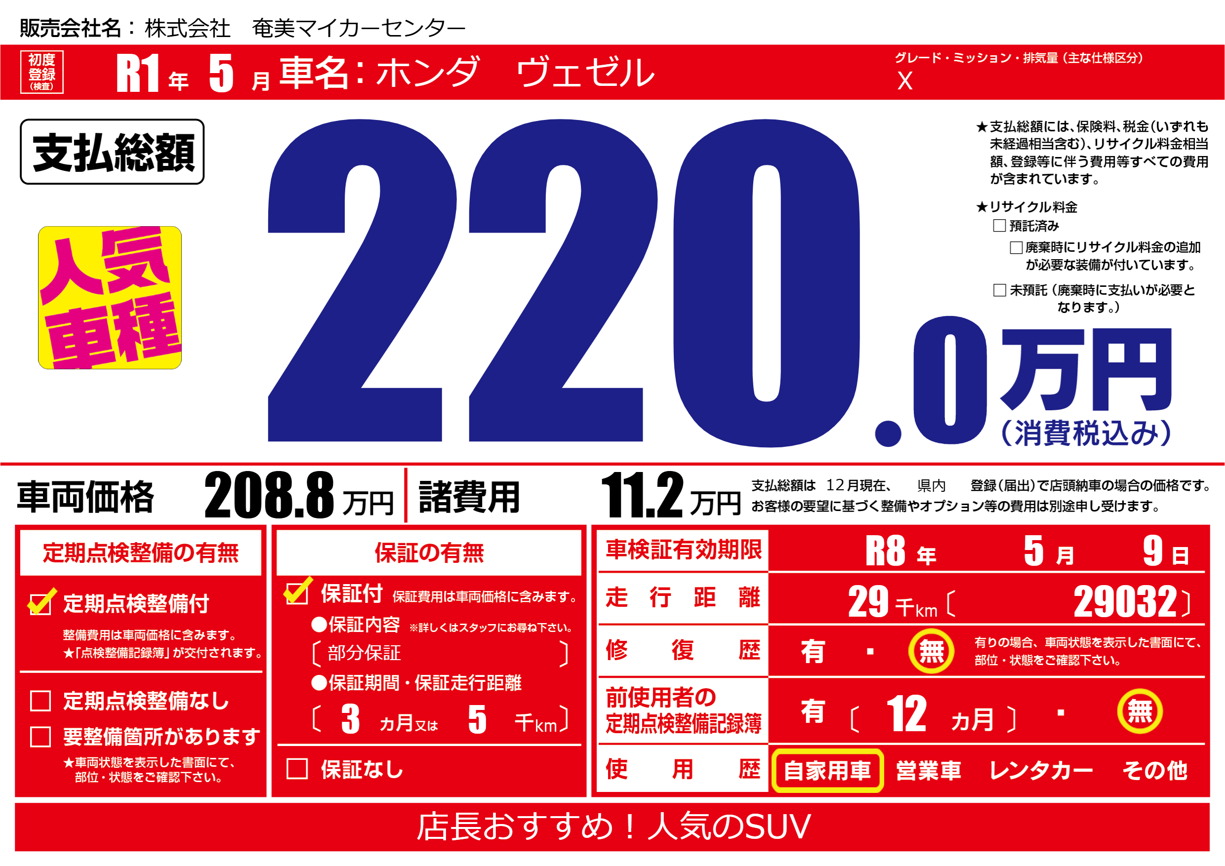 | 走行キロ | 2.9万km | 初年度登録 | R1年5月 |