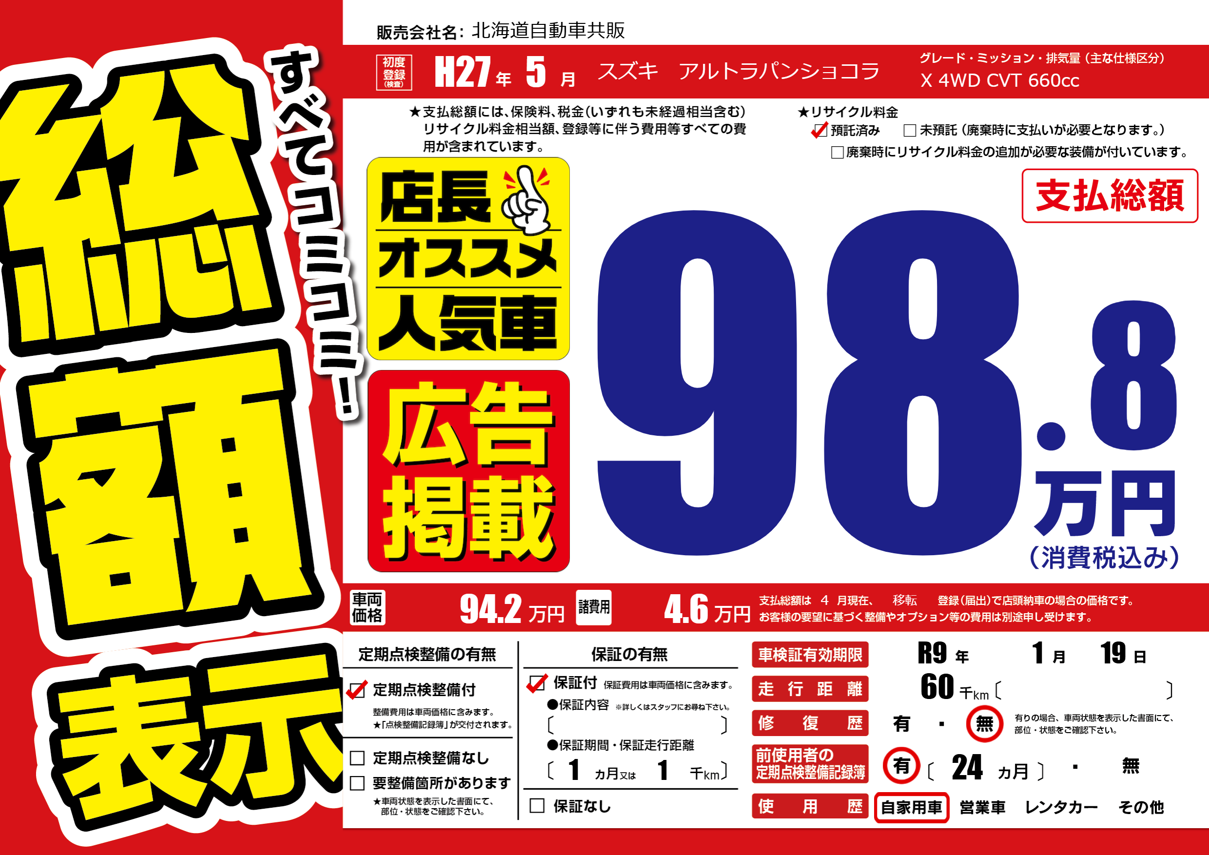 | 走行キロ | 6万km | 初年度登録 | H27年5月 |