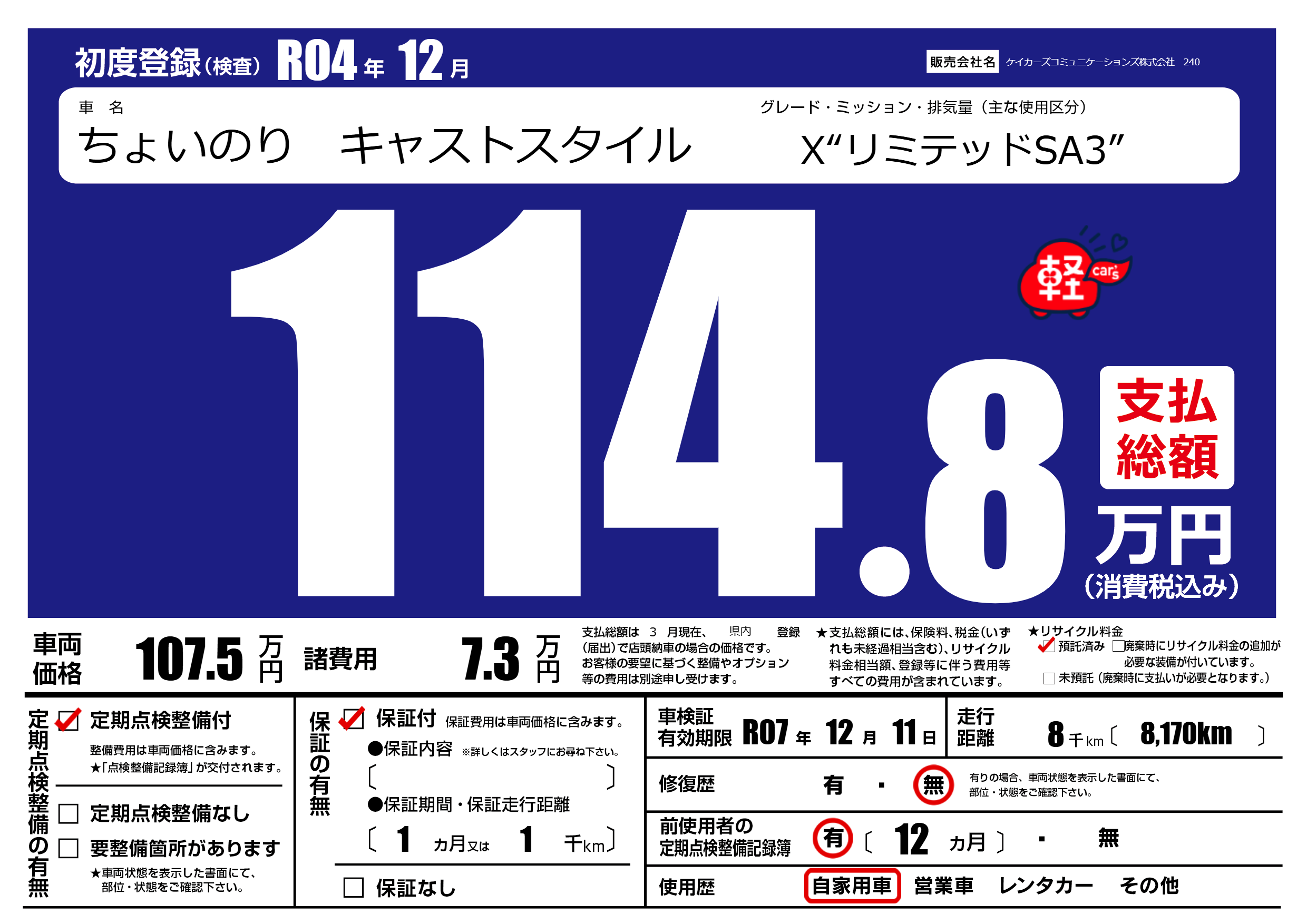 | 走行キロ | 0.8万km | 初年度登録 | R04年12月 |