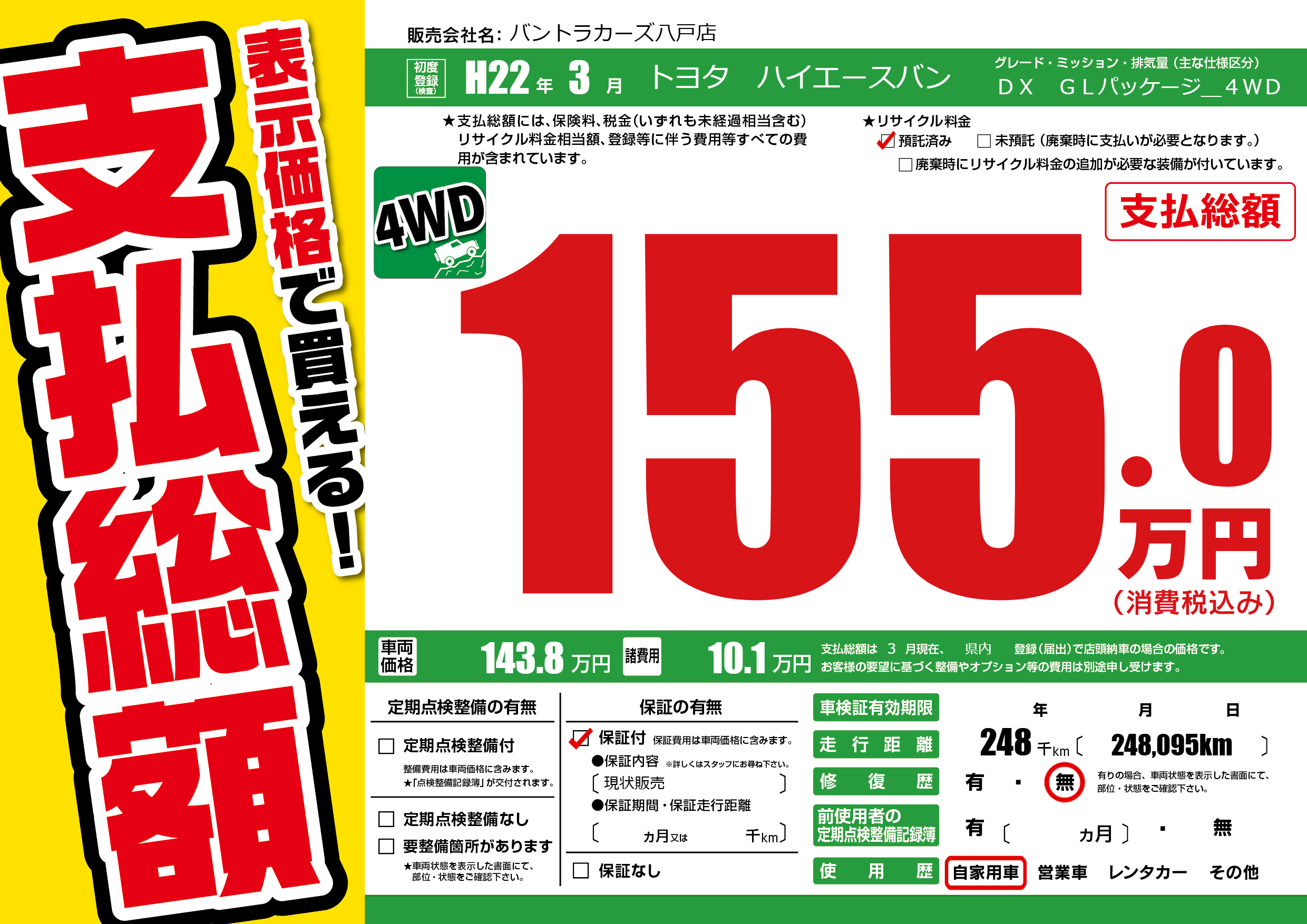 | 走行キロ | 24.8万km | 初年度登録 | H22年3月 |