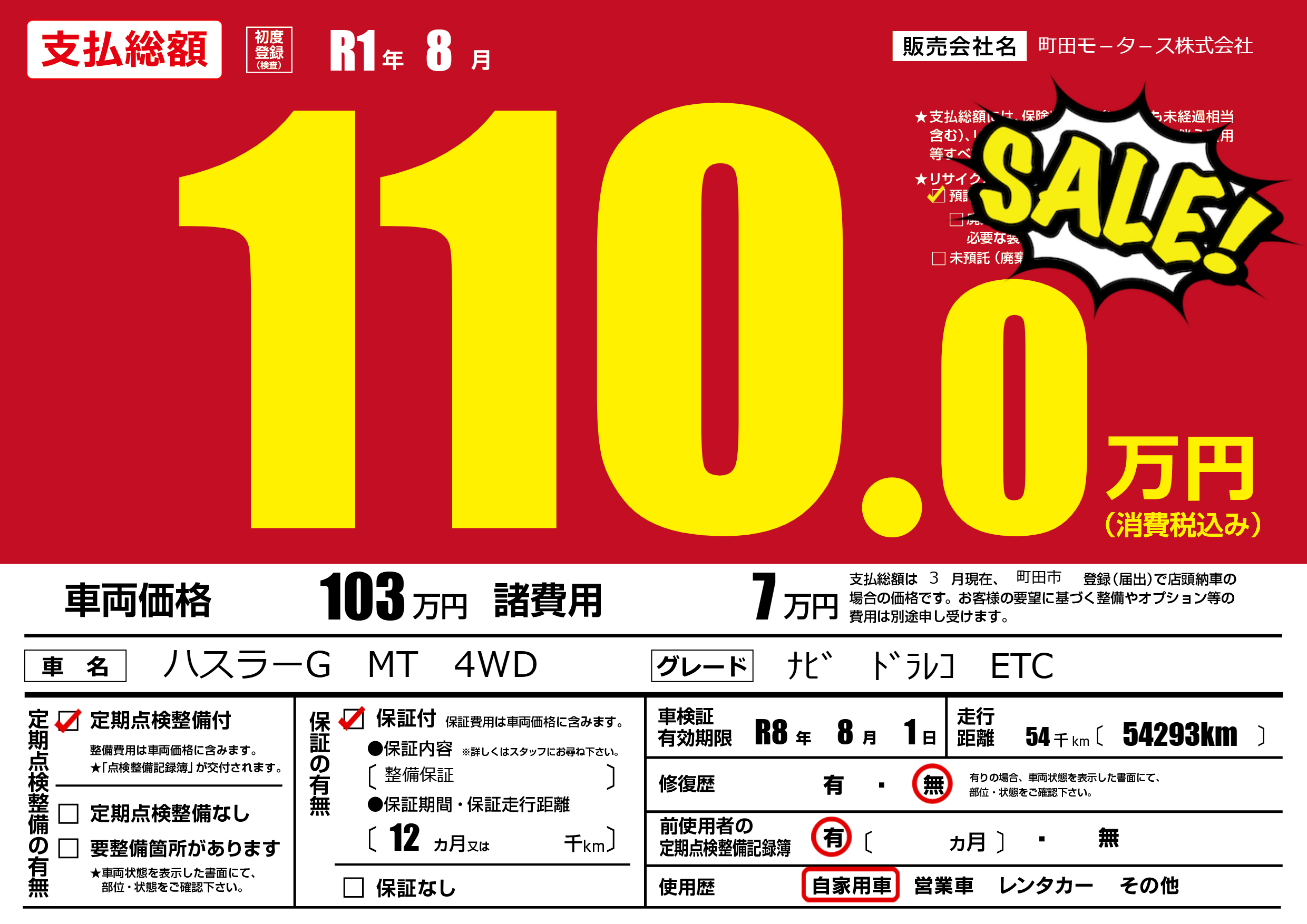 | 車検制限 | R8年 8月 1日 | ||