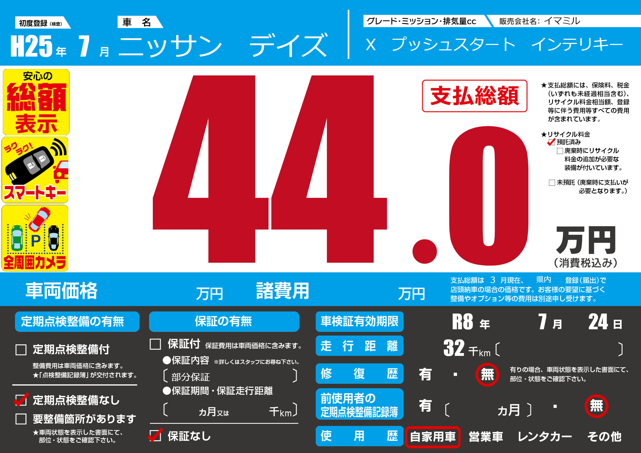 | 車名 | ニッサン デイズ | グレード ミッション 排気量 |